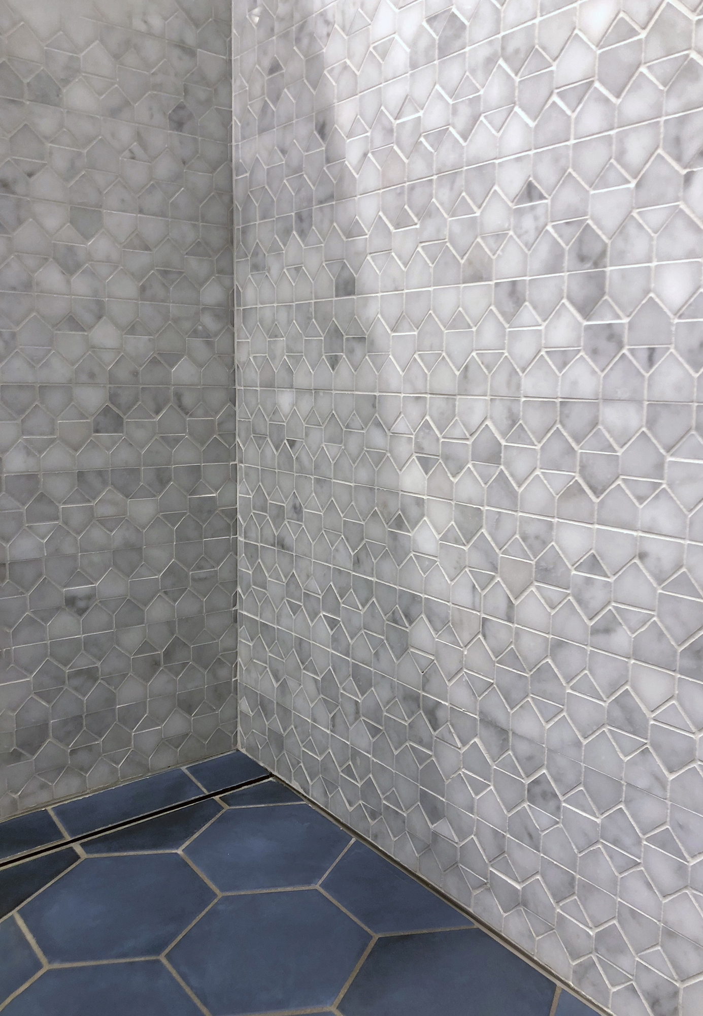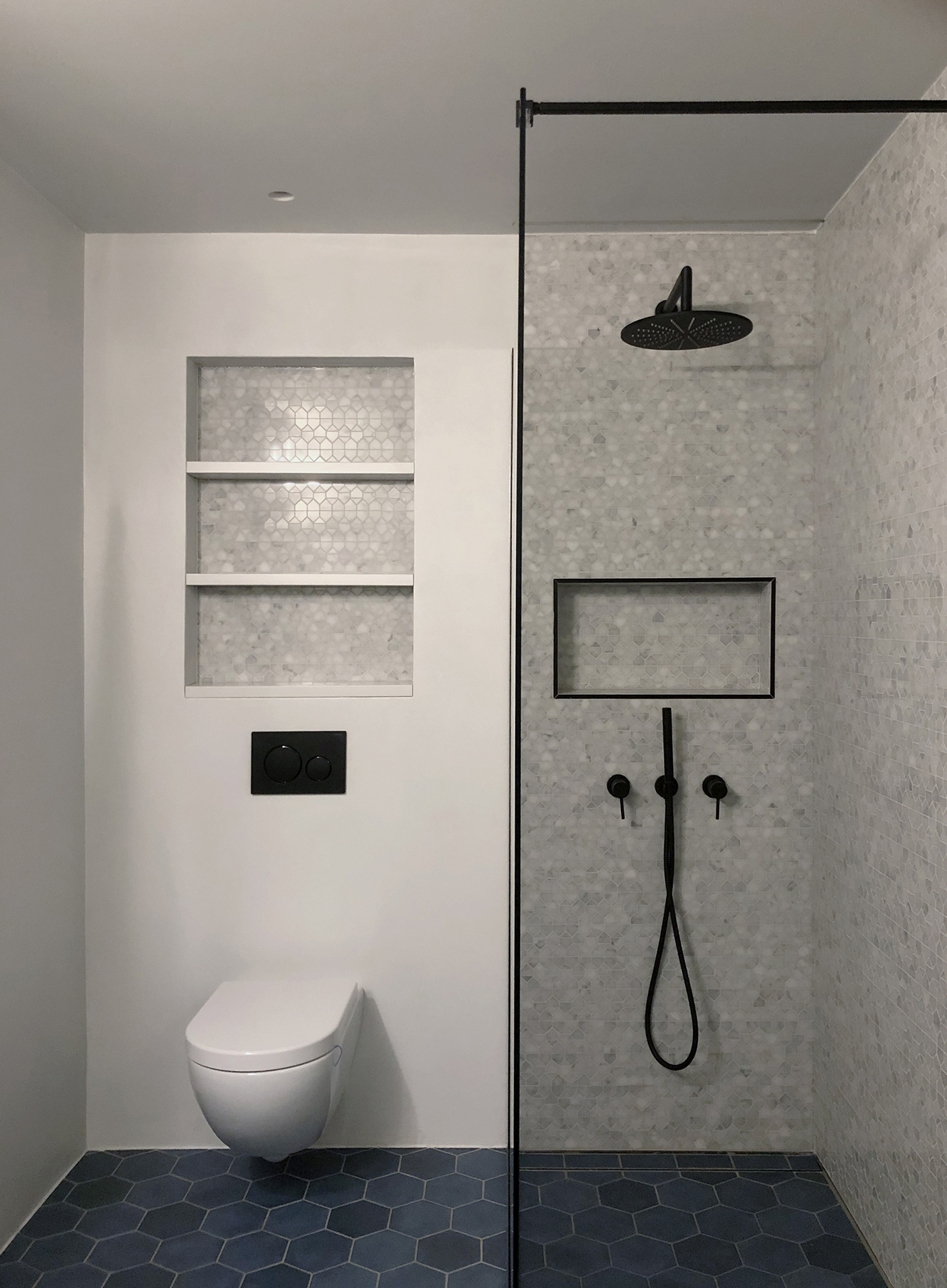The clients love blue and wanted a house in which the colour was used in a different way in each room. The idea behind this bathroom was creating flooring in which not only the size but the different hues of the tiles would contribute to the textured effect of the surface.