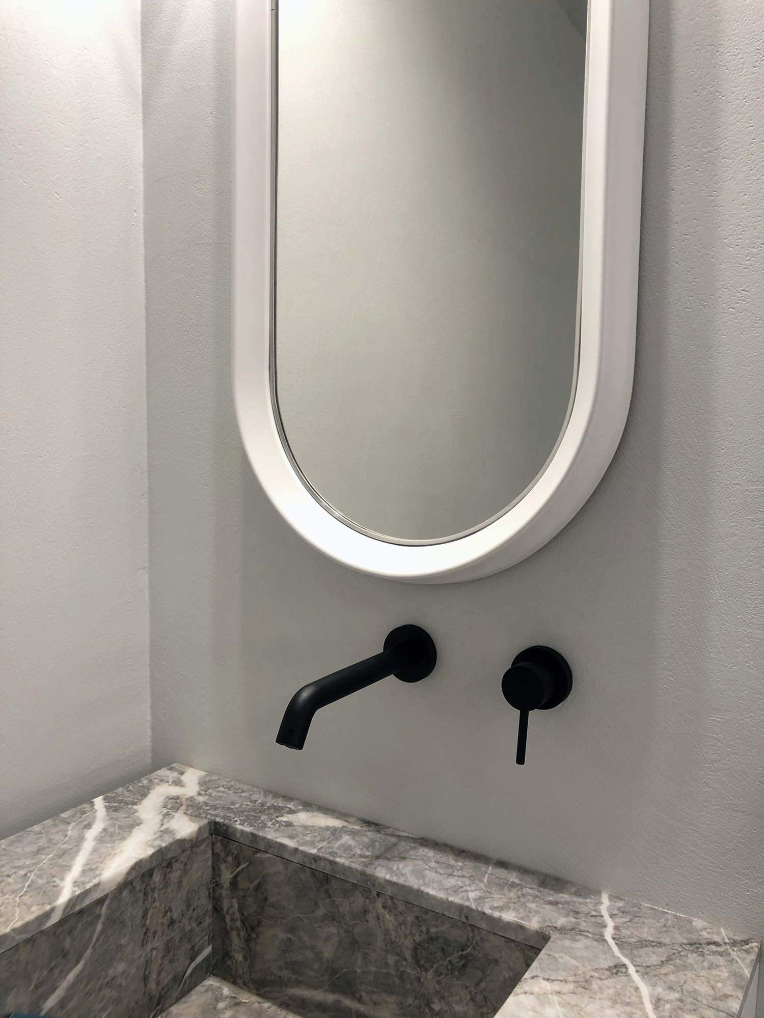 We combined the blue floor with neutral hues of grey and white in the walls, ceiling and bathroom furnishings. This underlines the floor by contrast, making it the key to the whole room.