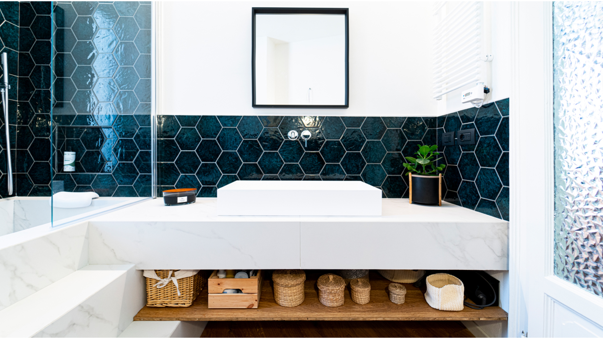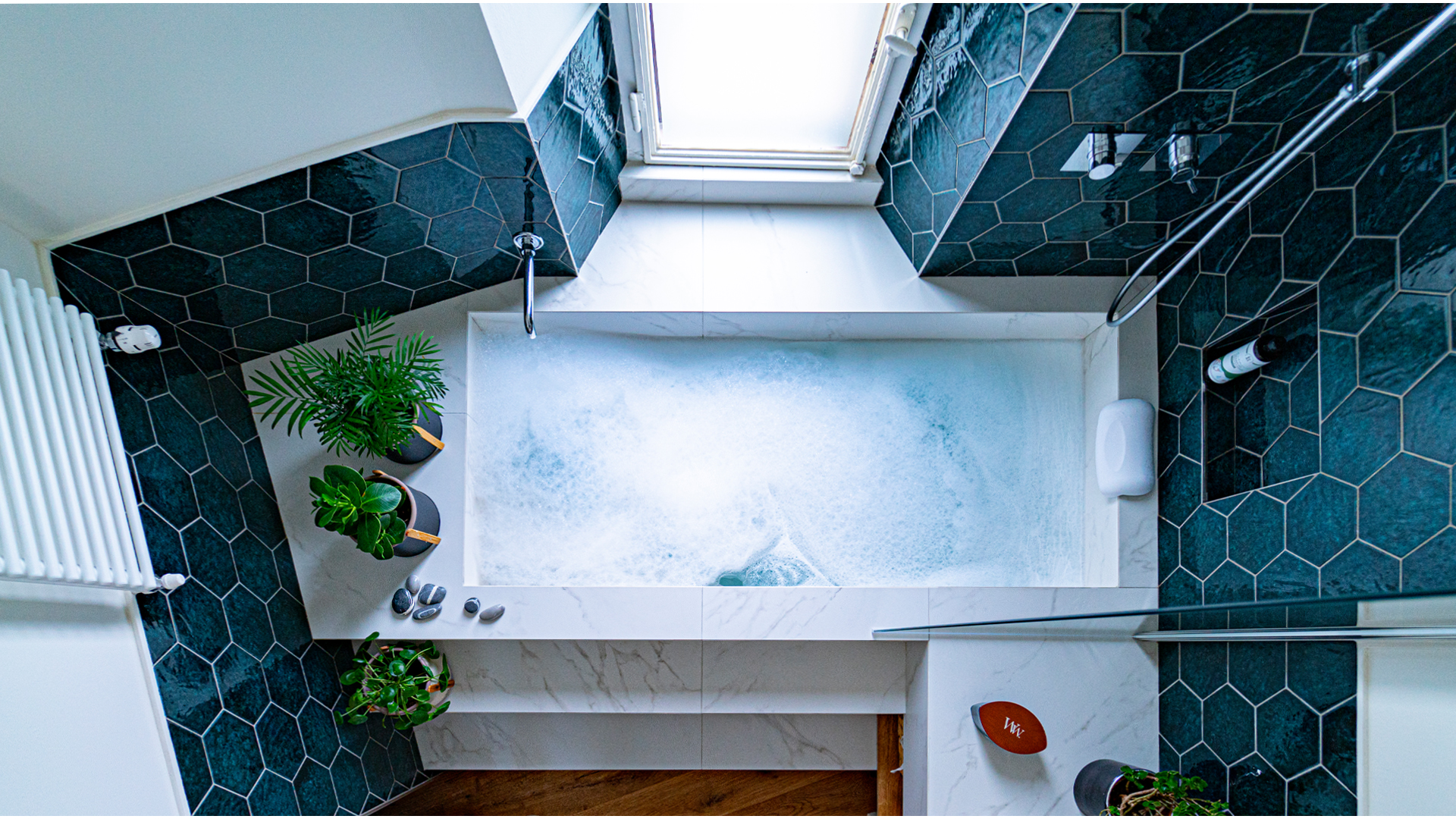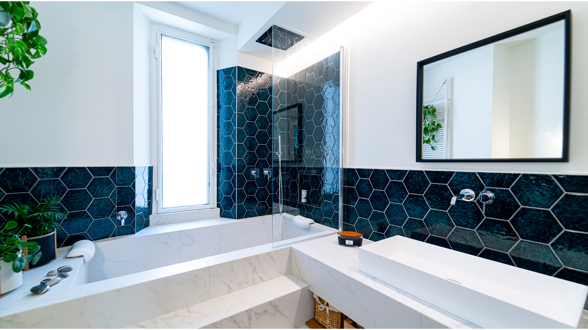 The natural light that pervades the bathroom changes the colour of the irregular surface of the tiles, which can never be attributed to a single colour: they range from petrol blue to emerald green.