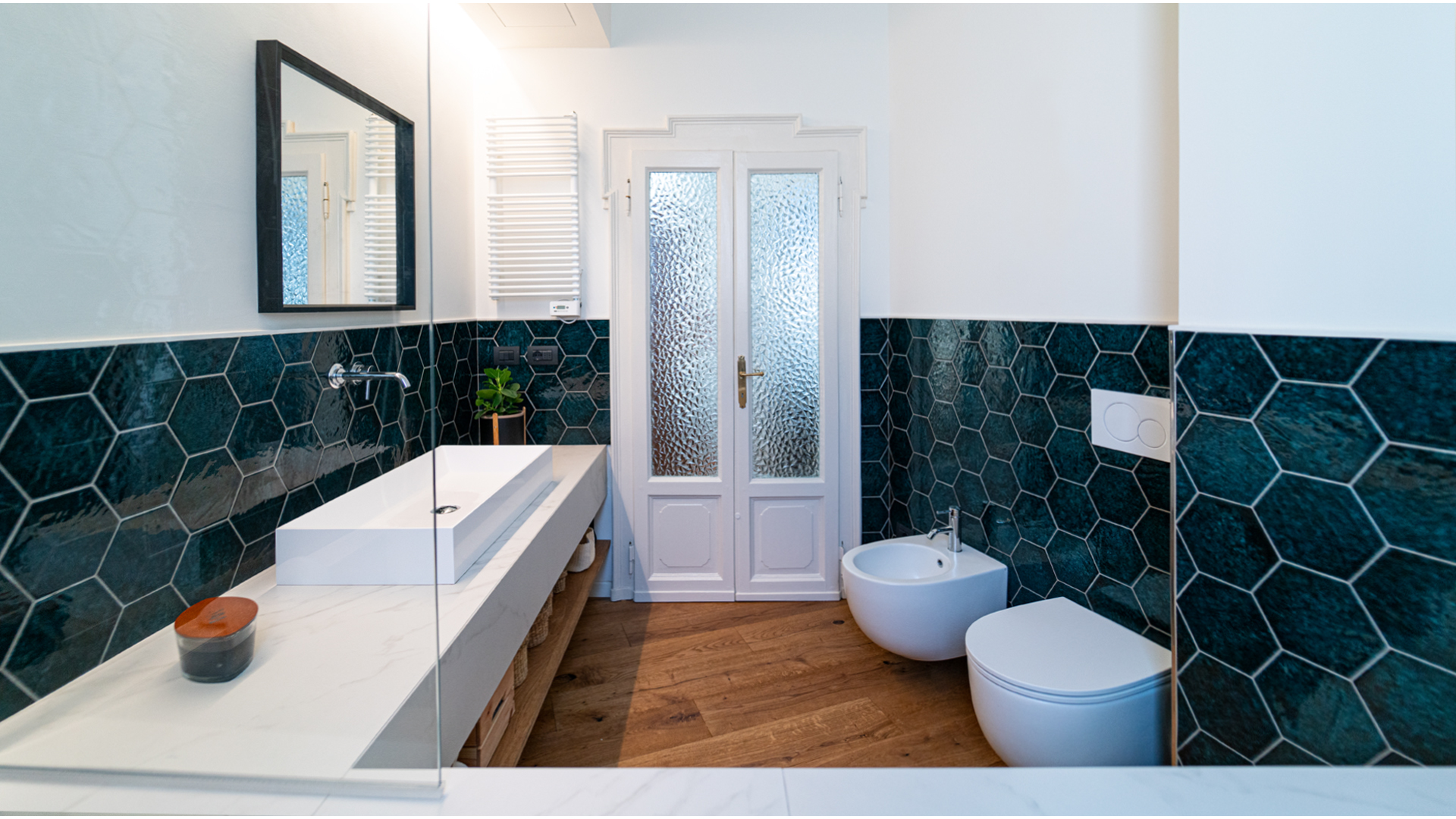 This bathroom was created with the intention of recalling the colours of nature to rediscover serenity and harmony in your domestic space. Hence the choice of Tonalite Esamarine tiles in Petroleum colour, which recall the colour of the sea and at the same time the green of nature, and the choice of wood on the floor to warm up the whole place.