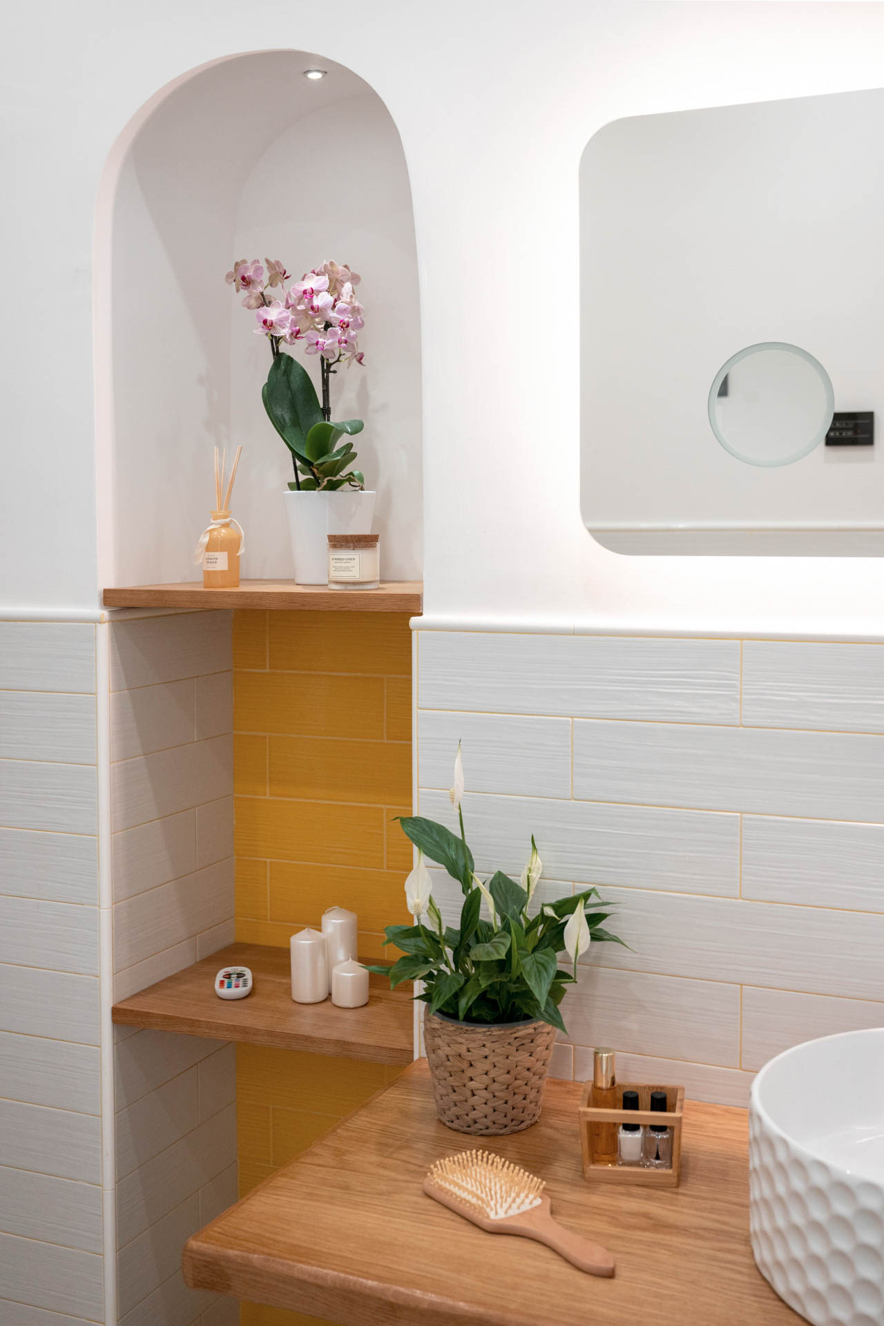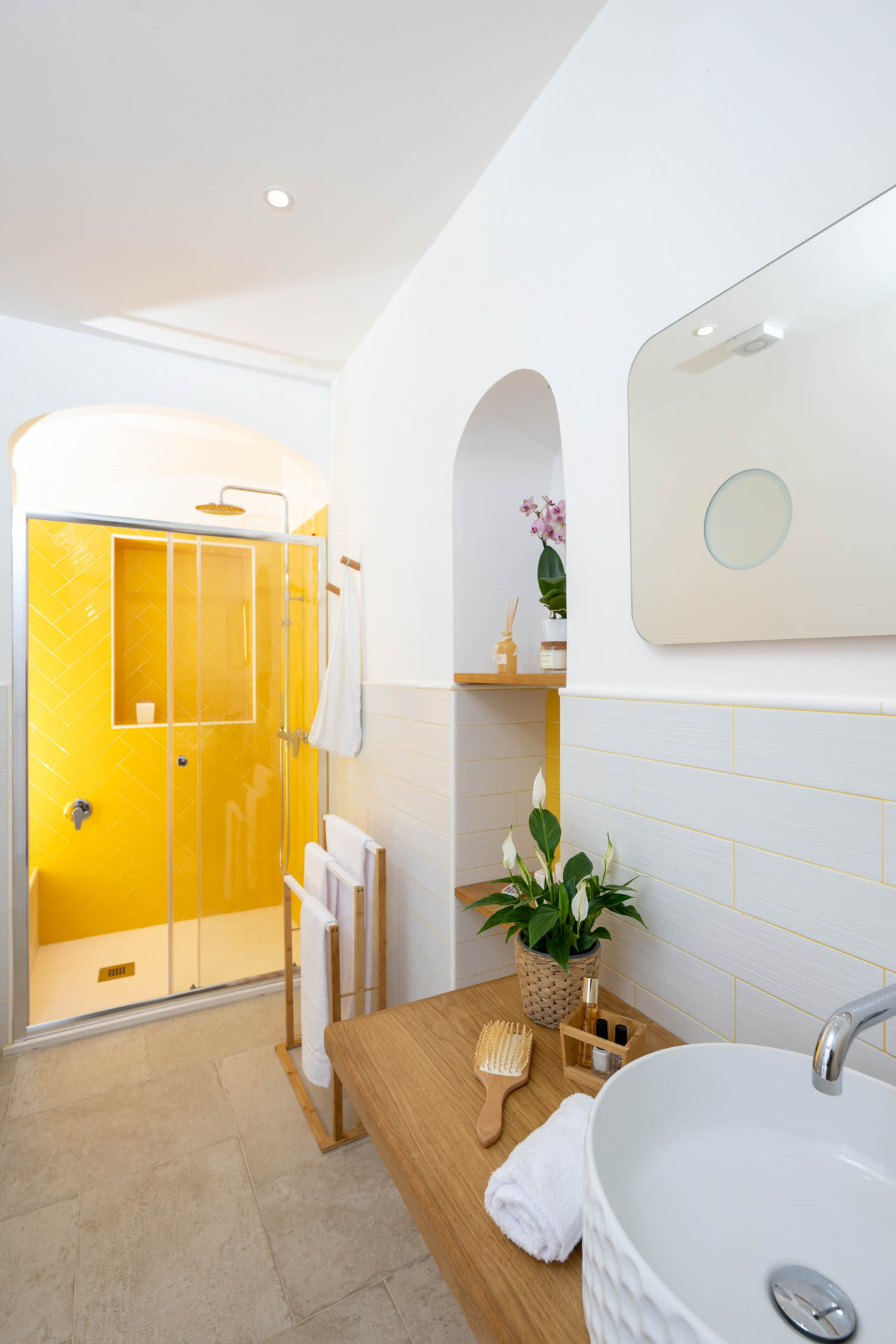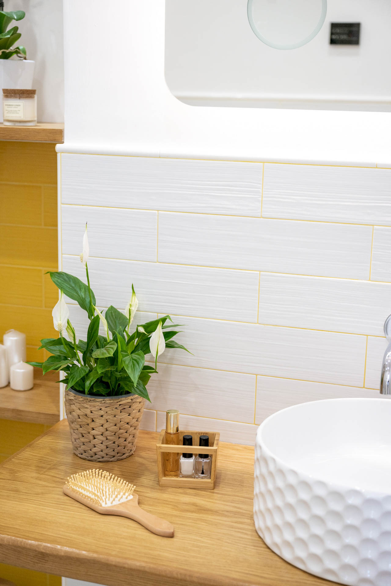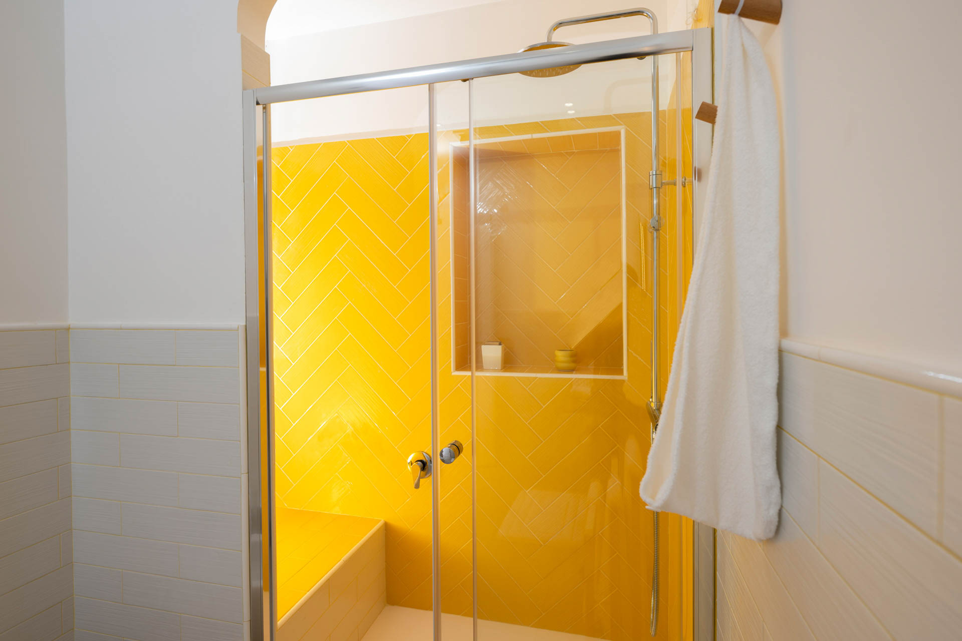 I created beautiful contrasts by using two colors: yellow and white. For the shower, I chose the color yellow, laying Paintboard tiles in a herringbone pattern and creating a contrast with the rest of the bathroom where I used the same format, but in white, recalling the yellow of the shower in the joints.