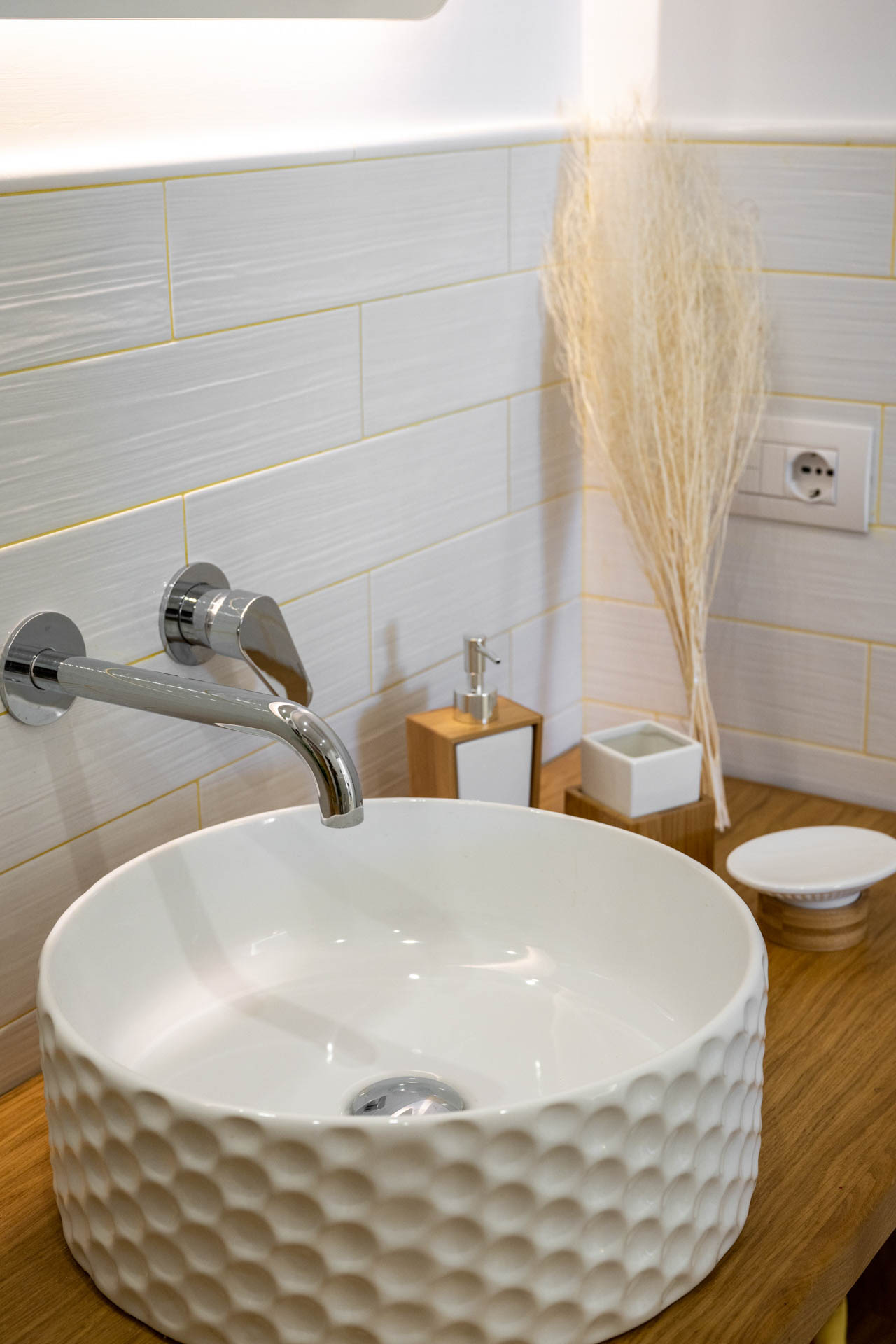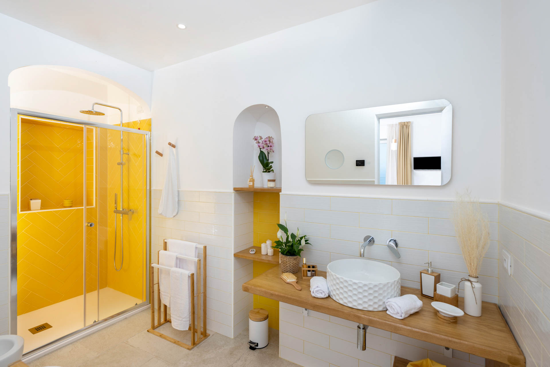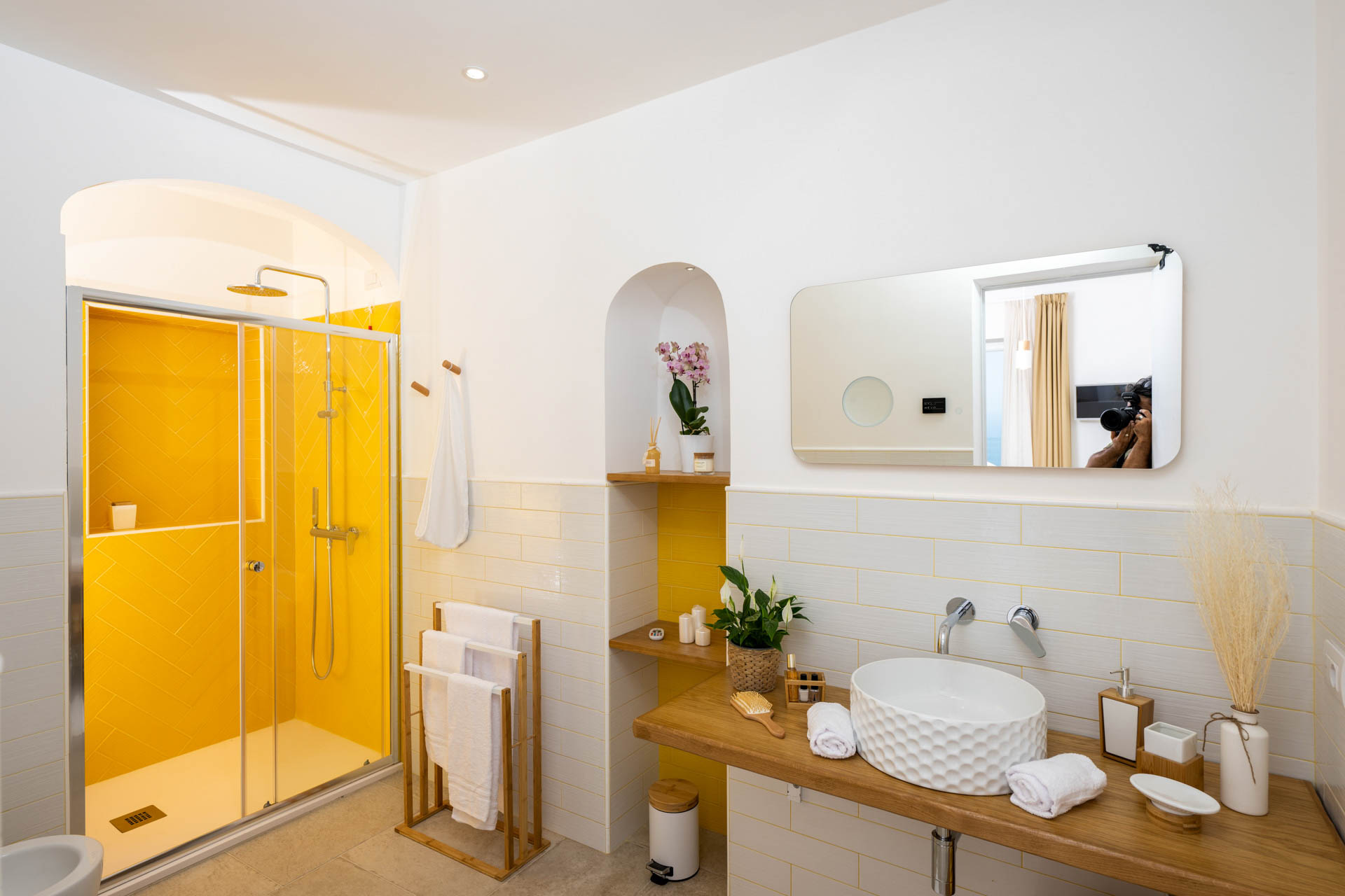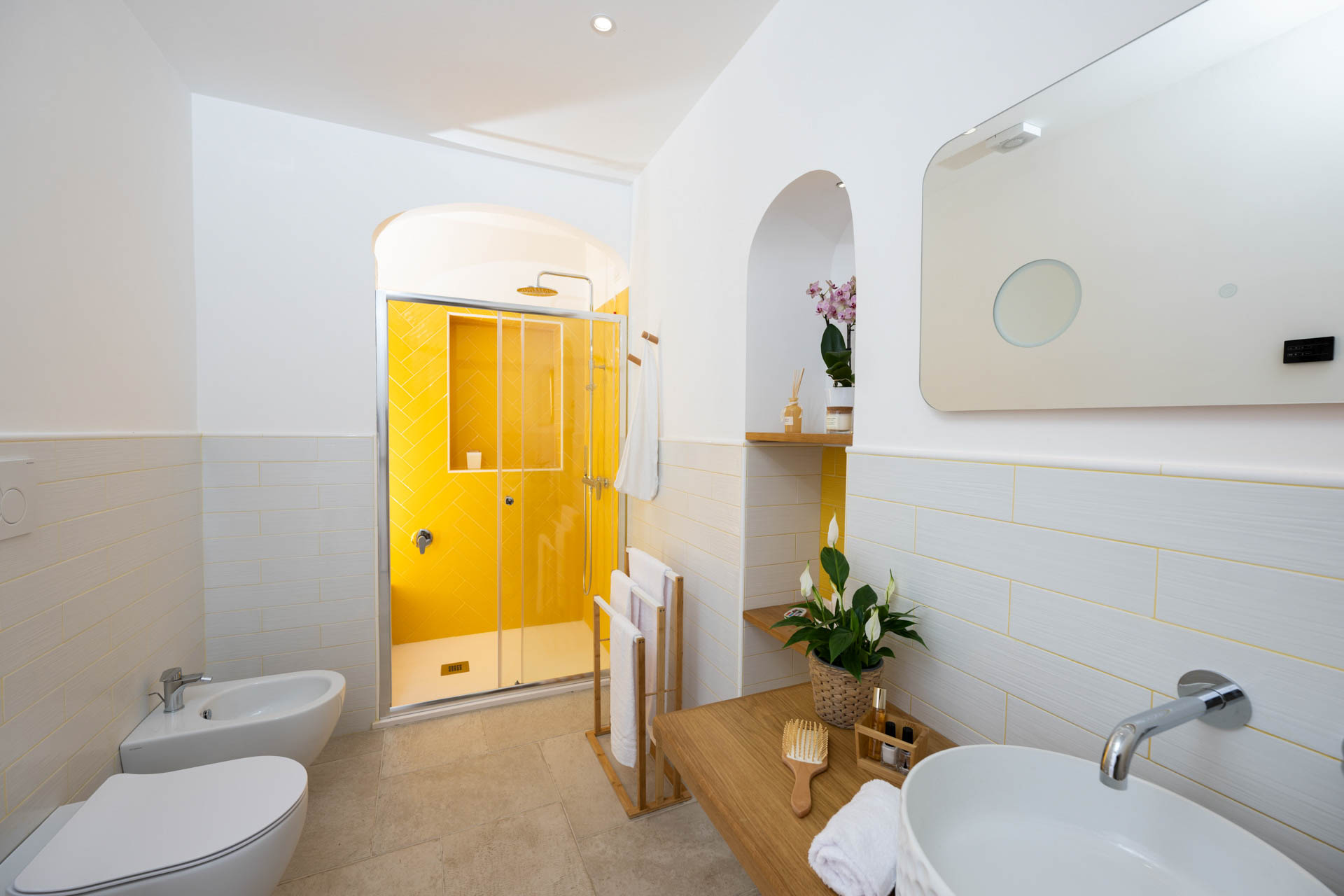 I created beautiful contrasts by using two colors: yellow and white. For the shower, I chose the color yellow, laying Paintboard tiles in a herringbone pattern and creating a contrast with the rest of the bathroom where I used the same format, but in white, recalling the yellow of the shower in the joints.