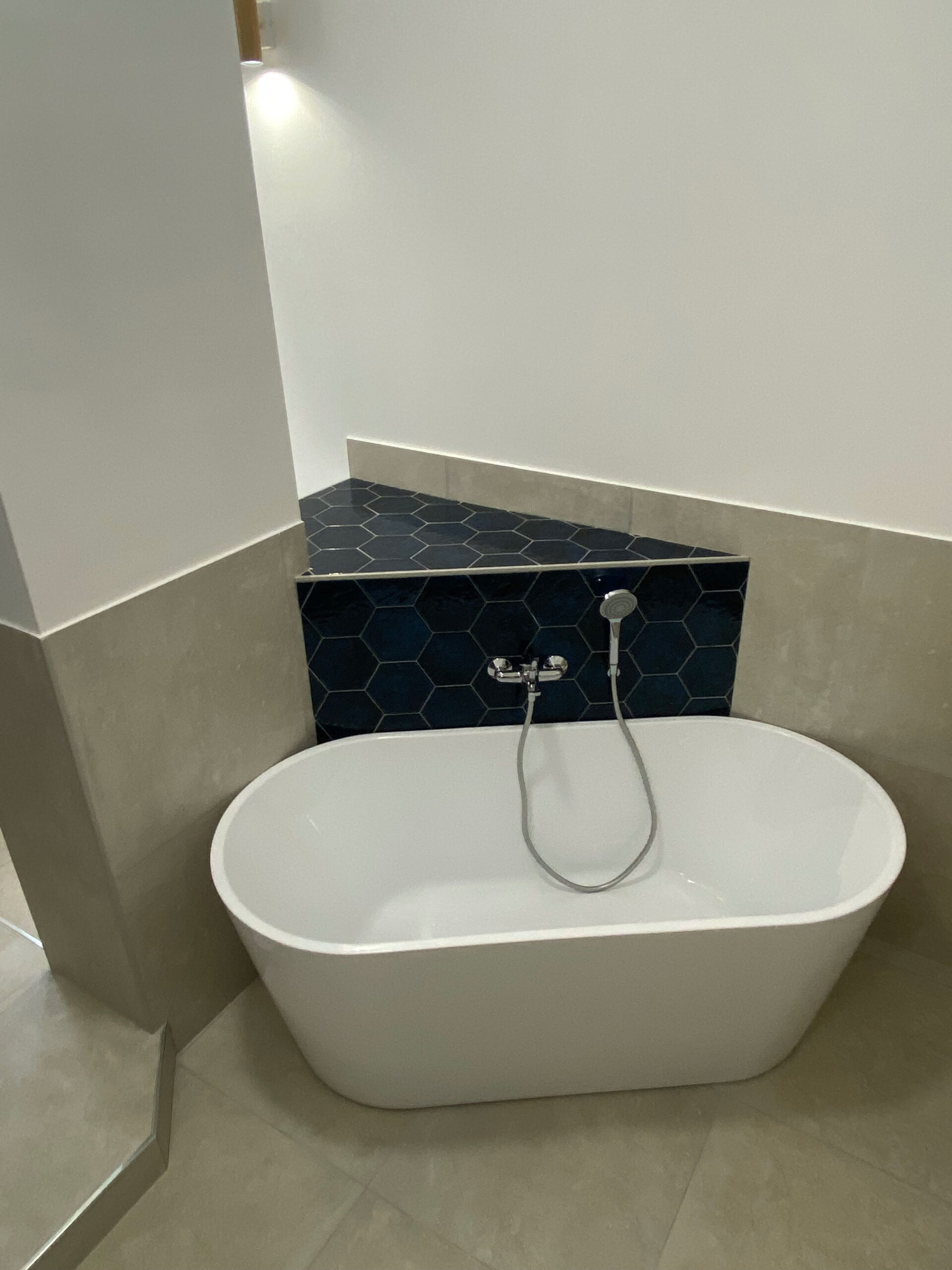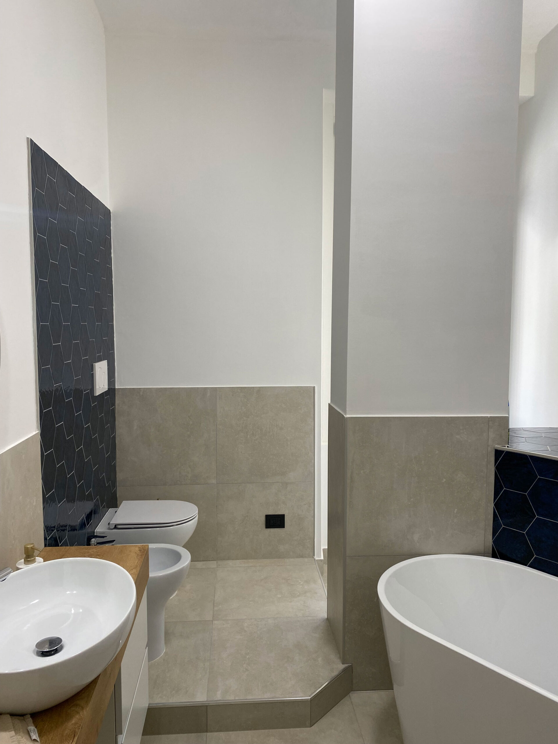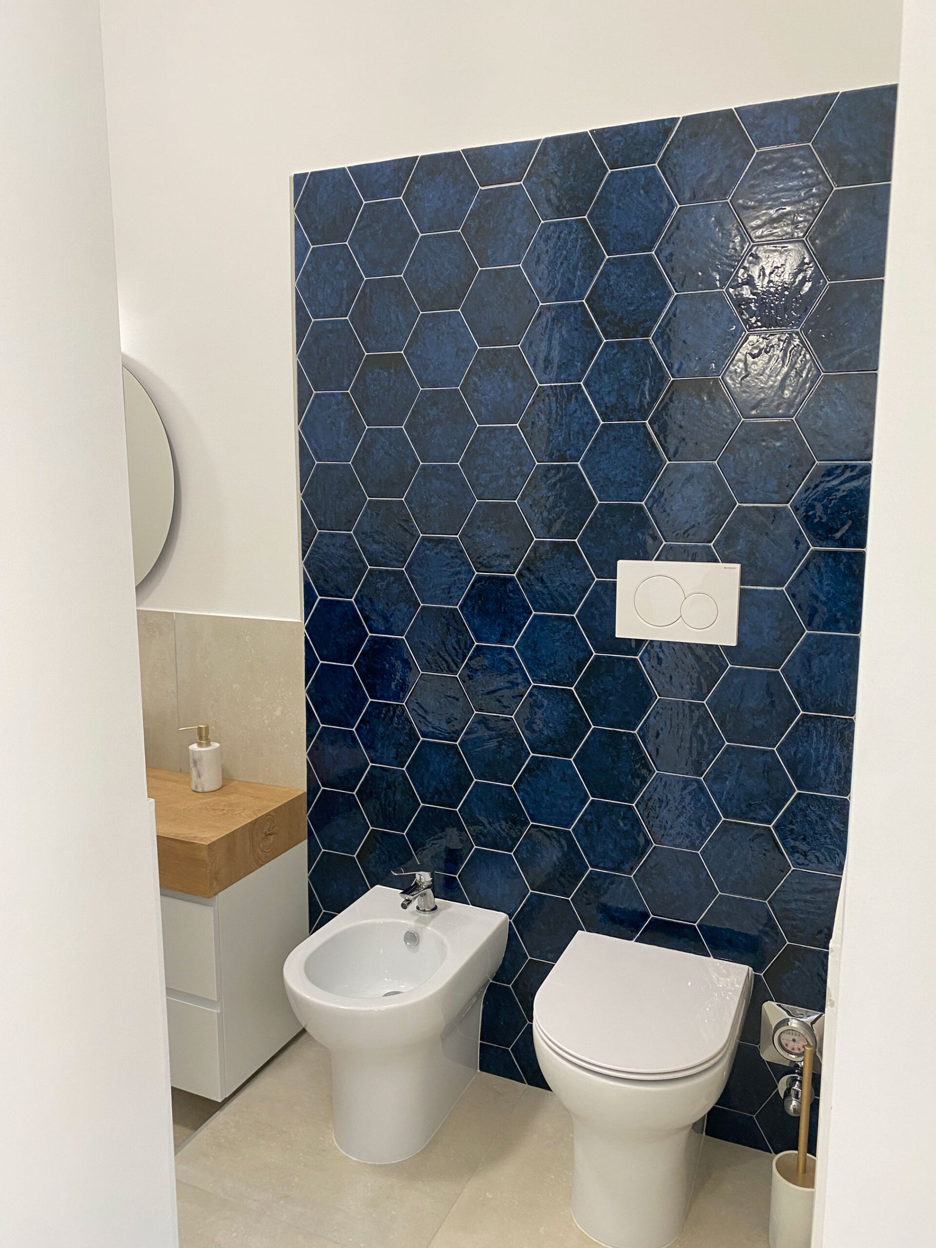 In the bathroom in the living area, we used blue hexagonal tiles: an unusual shape and colour to set off the white of the bathroom fixtures and bathtub, also underlined by the contrast with the very pale grey porcelain.