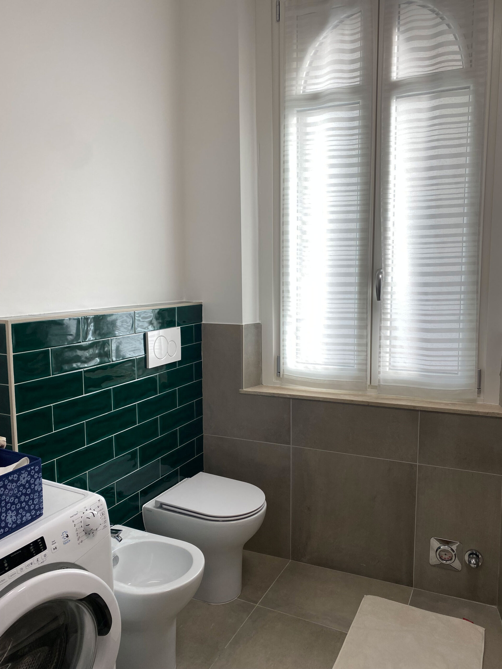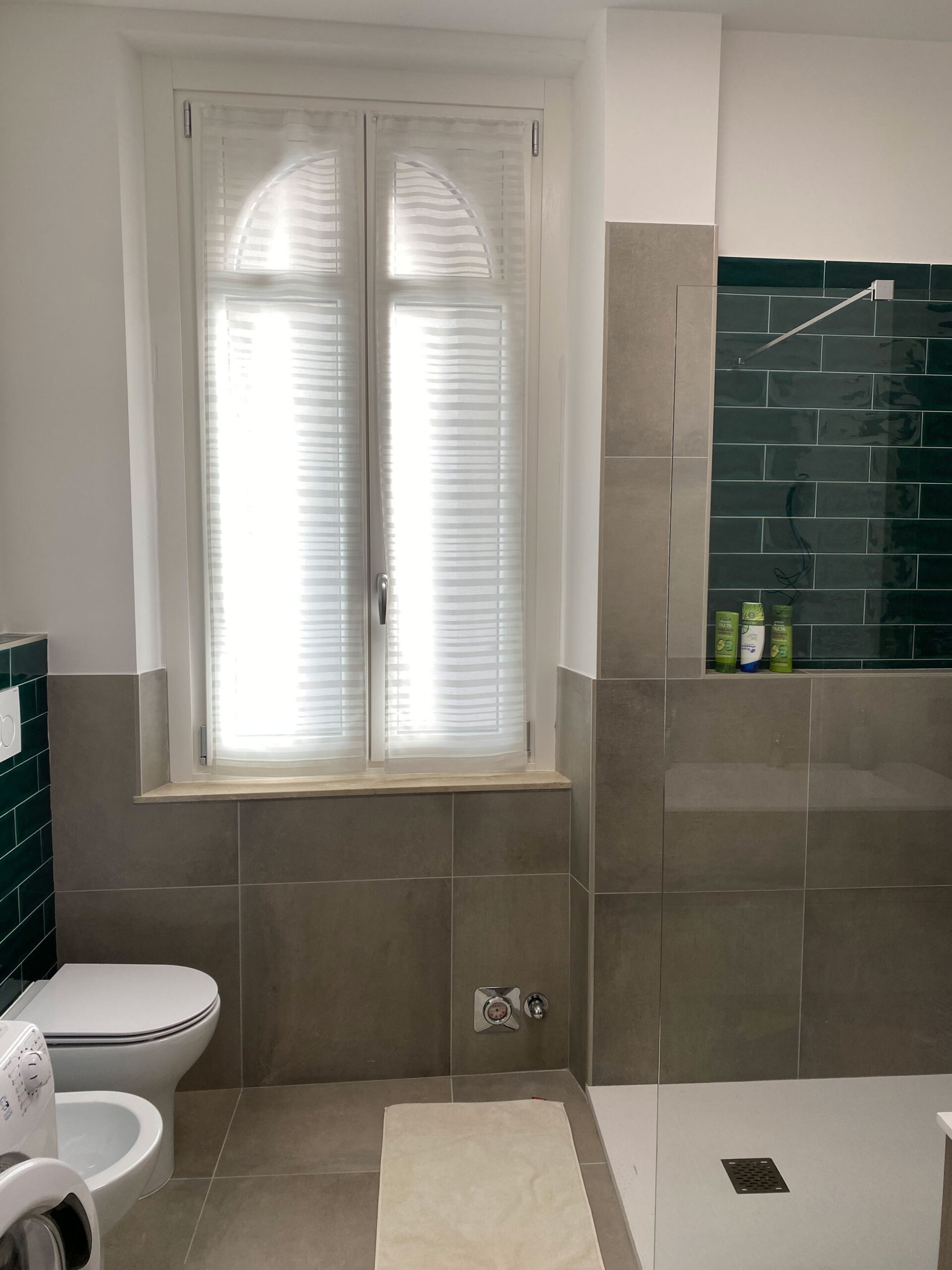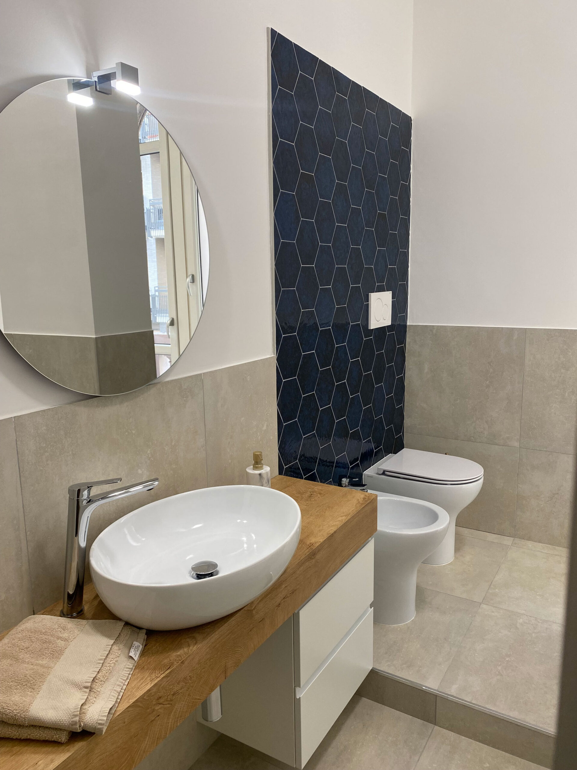 In the idea for the design of the two bathrooms we wanted to include a note of bright colour to avoid the usual all-grey bathroom.