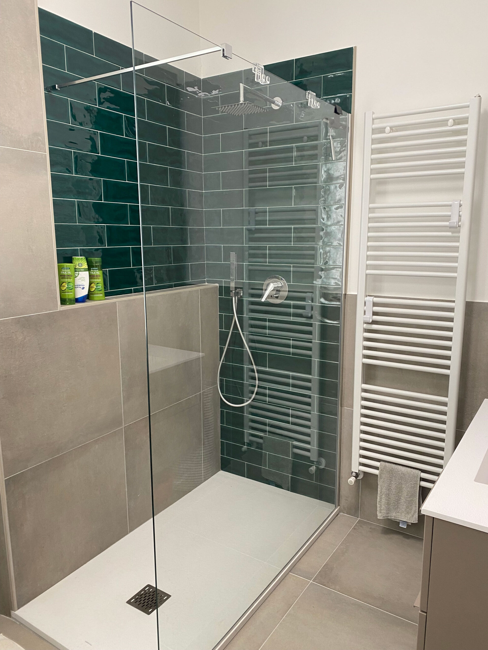 For the bathroom serving the bedrooms we chose a bottle-green rectangular tile. Its bright, shiny surface laid in an offset brick-like pattern adds a note of colour alongside the grey porcelain wall and floor coverings.