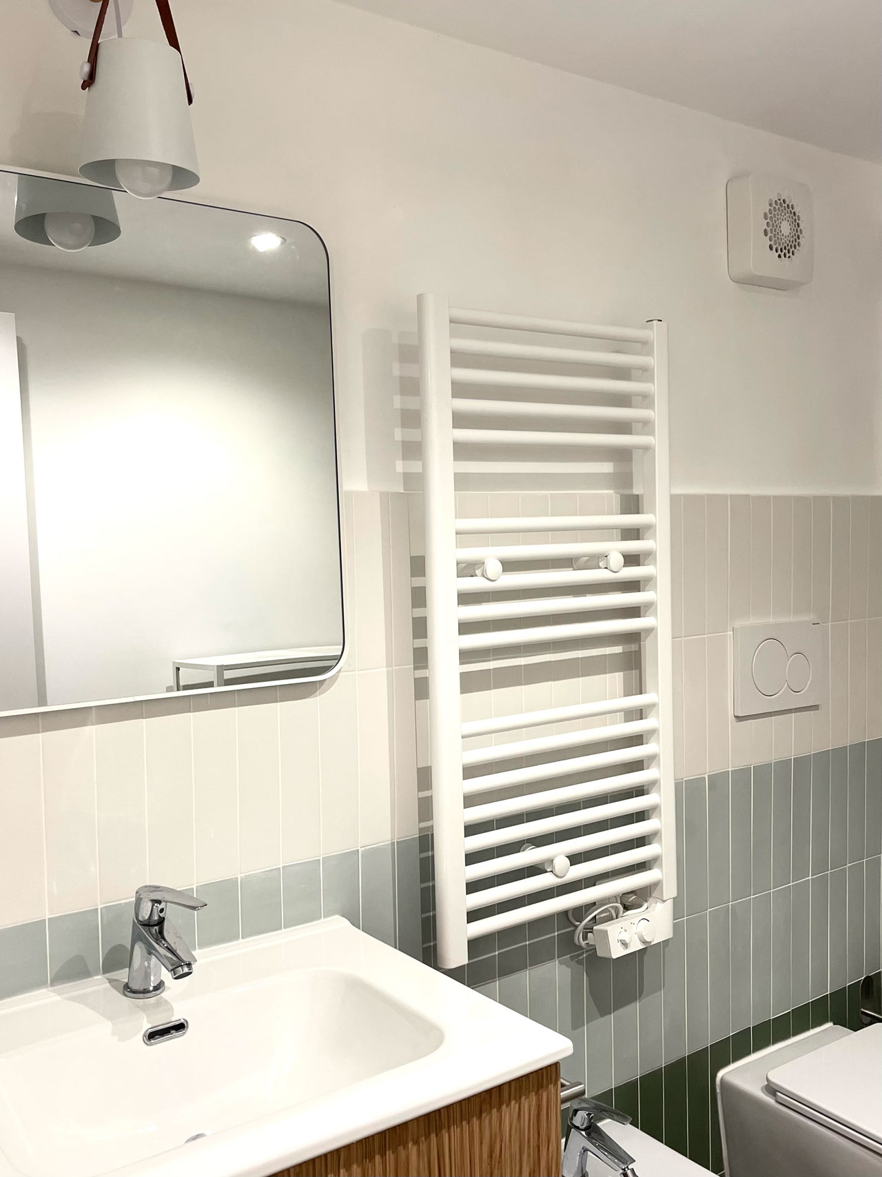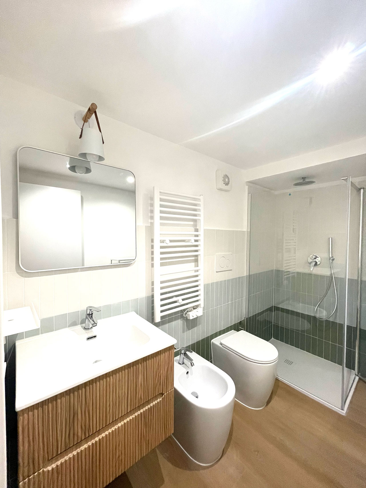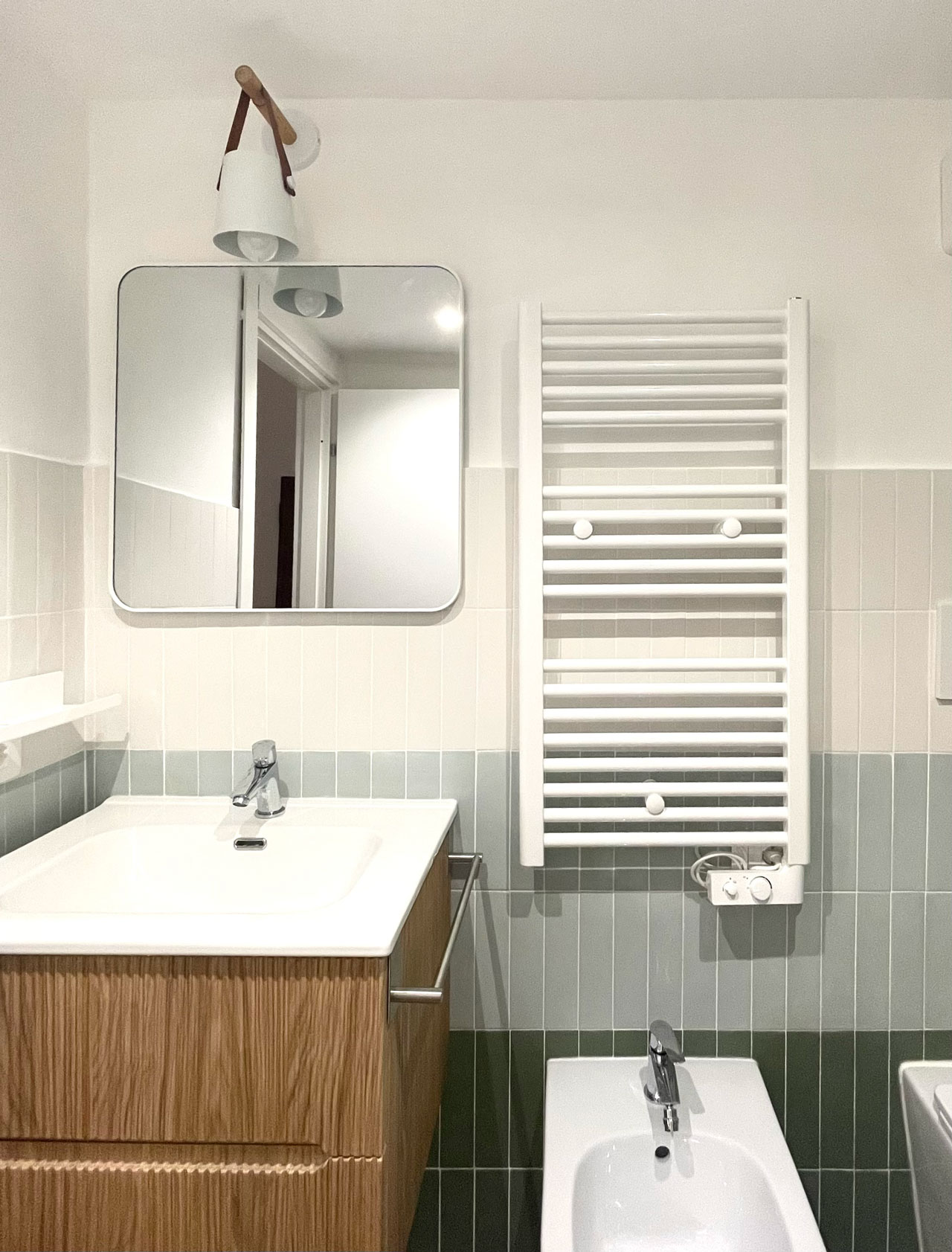 We used Lingotti tiles in dual shades-Matt Lingotto Foresta and Verdino-to create a vertical composition that gives the space depth, rhythm and character. The quality of the material and color variety made Tonalite the ideal choice for a small but identity-rich bathroom.