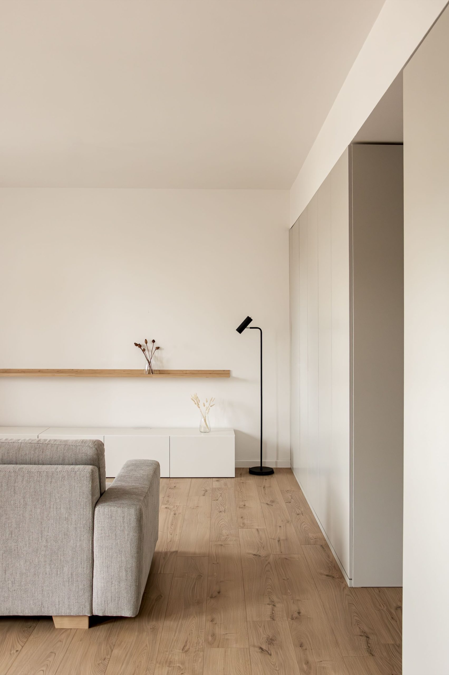 The vertical laying used for the wall coverings creates a visual effect that adds height and momentum to the room, making it airy and dynamic, while connecting the floor and walls in a harmonious and cohesive way