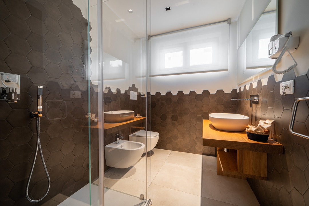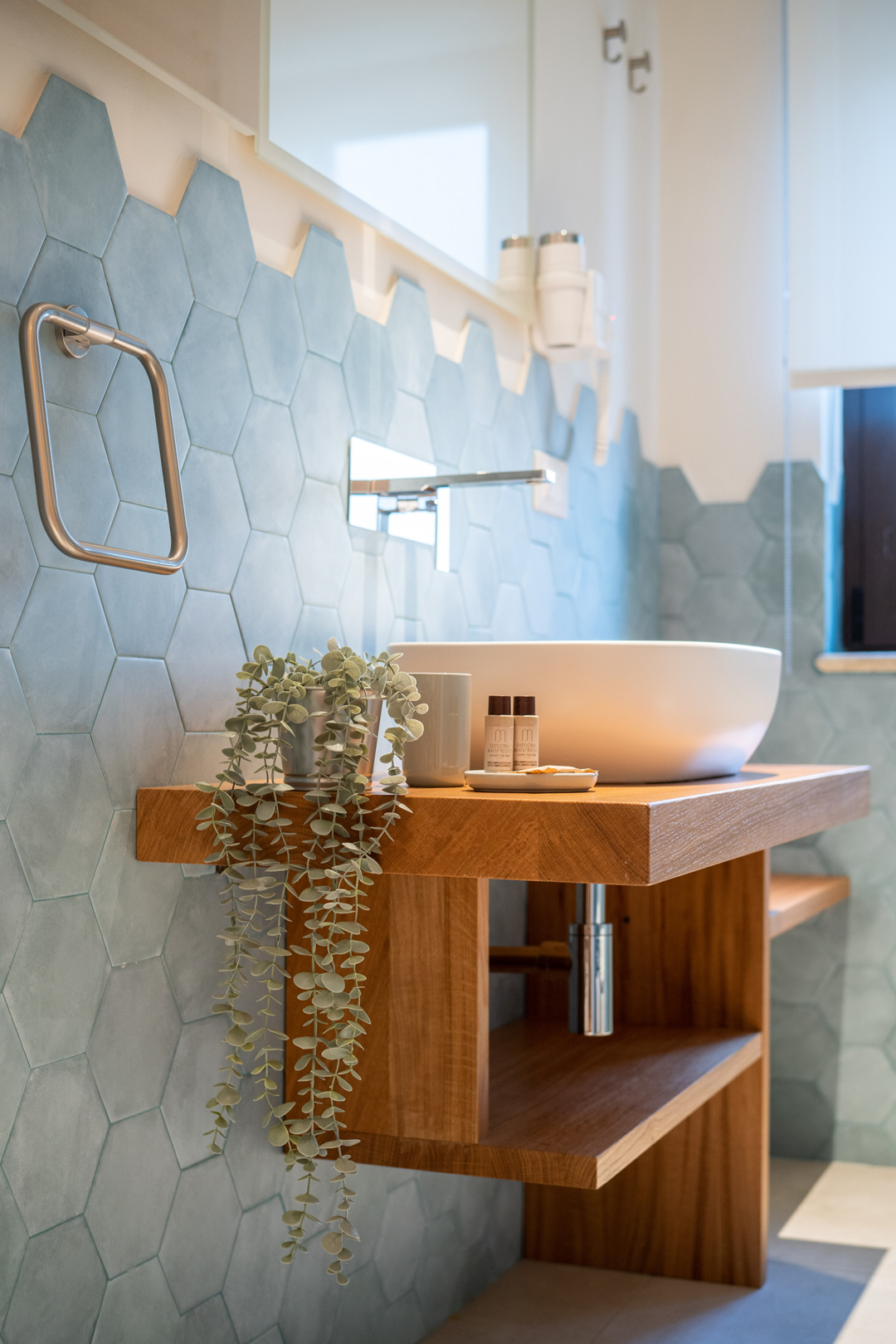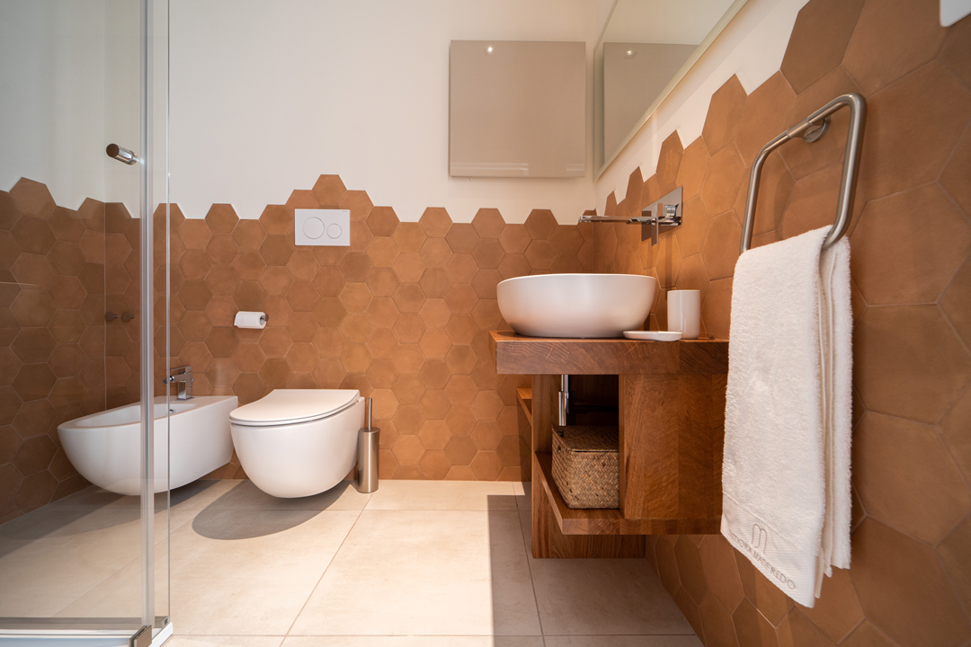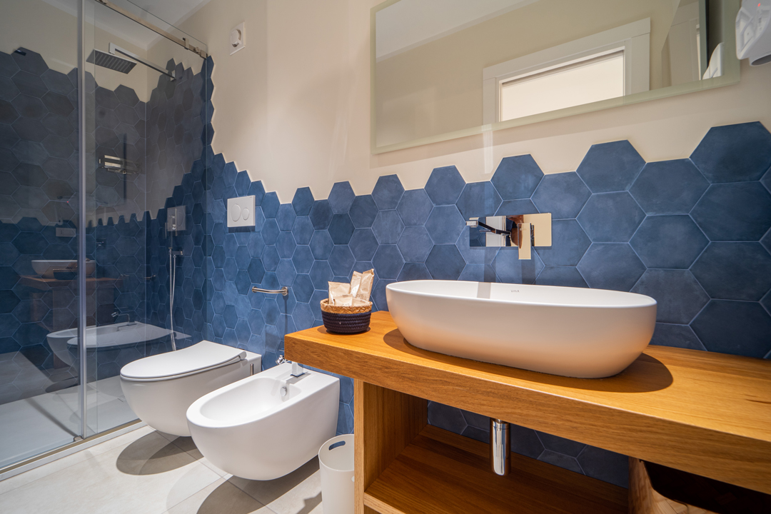 Il progettista di questo B&B di San Nicola Arcella (CS) si è orientato sulle collezioni Exanuance e Arabesque per rivestire i bagni e la testata di una delle stanze da letto. Nella scelta dei colori è stato guidato da un criterio cromatico: i toni utilizzati ricordano, infatti, quelli della terra, del mare e del cielo. La superficie opaca cattura la luce e restituisce nuance piene e corpose, con tutta l’ampia gamma di sfumature che le caratterizza. La sensazione di continuare a circondarsi dei colori della natura anche all’interno è molto forte, ed è accentuata dalla scelta degli altri materiali. Il fatto di aver lasciato le pose aperte dà ai bagni della struttura un aspetto molto moderno e ricercato. Come abbiamo già osservato in questo articolo, la posa aperta rompe la cornice che ingabbia lo sguardo, attirando l’attenzione sul rivestimento ceramico che, da mero fondale, conquista il primo piano, divenendo protagonista dello spazio.