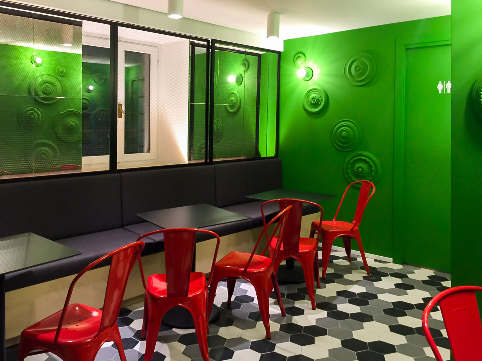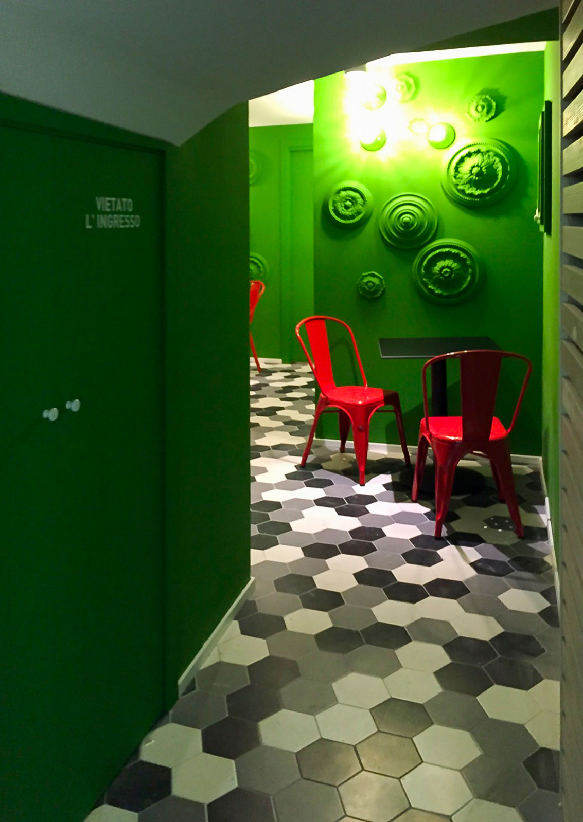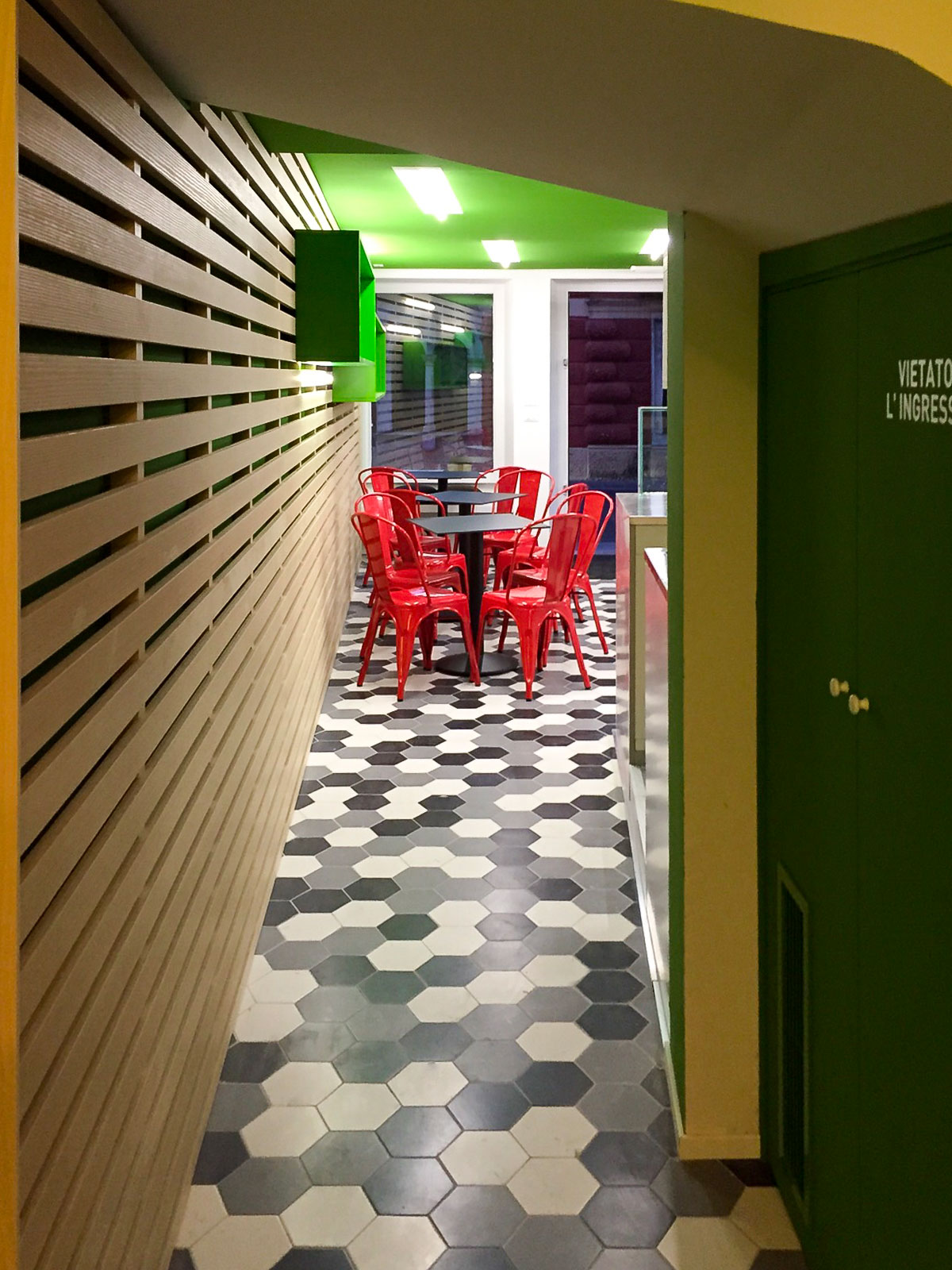 Volevo creare un ambiente che fosse moderno e allo stesso tempo che le piastrelle ricordassero i bar anni 50/60 della zona, visto che c’erano bar con questa tipologia esagonale e poi che fosse accogliente, moderno, rilassante, luminoso.
