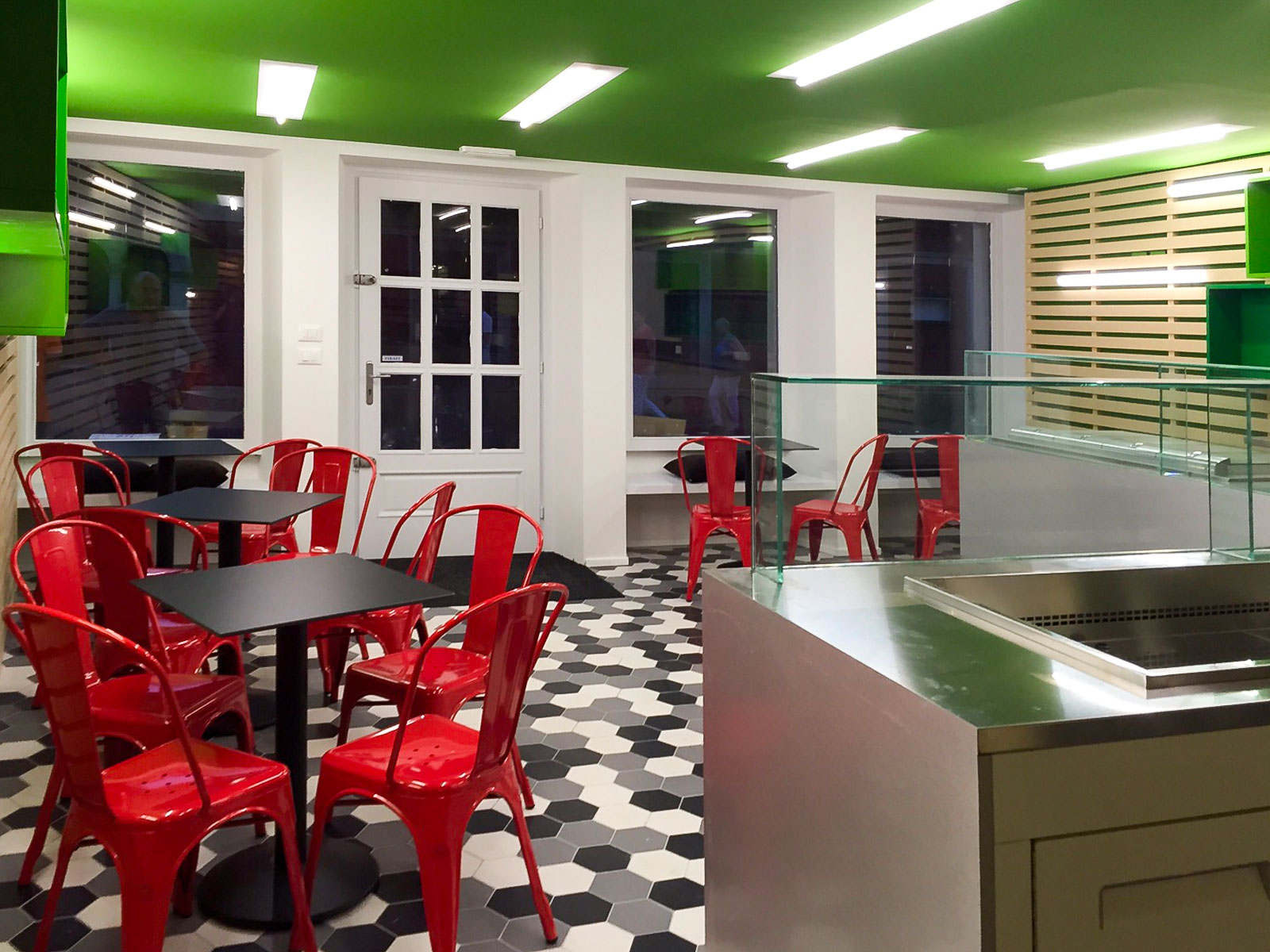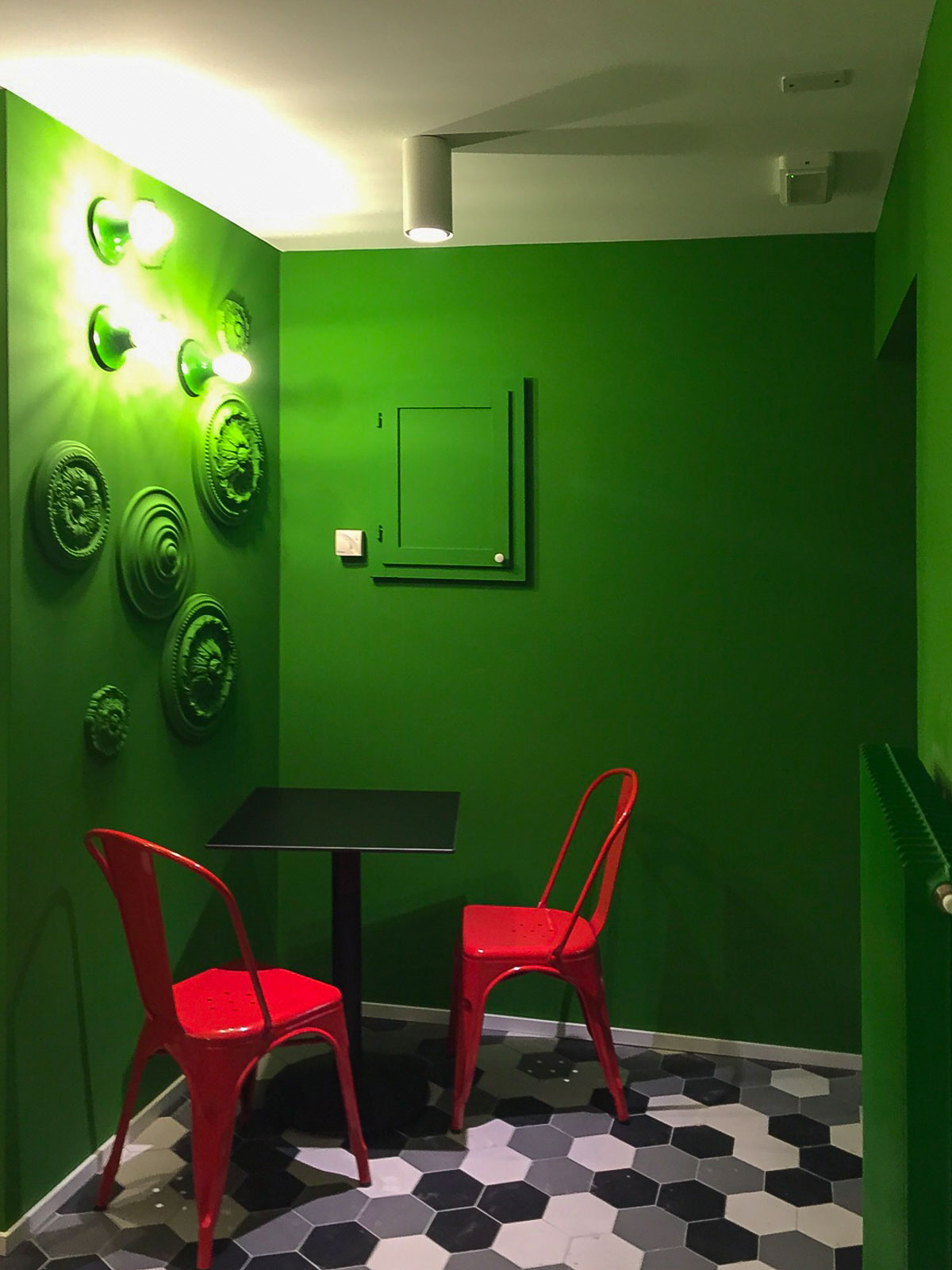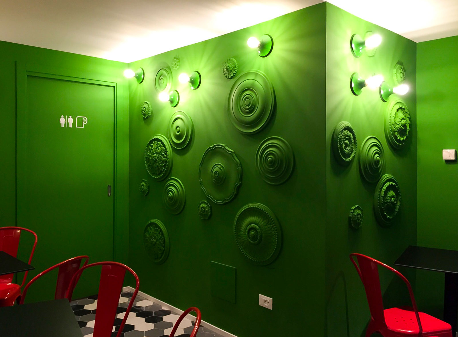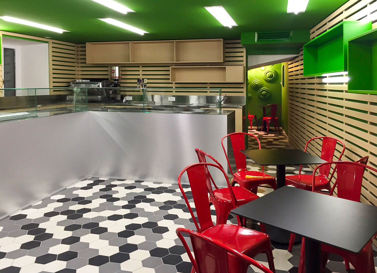 Volevo creare un ambiente che fosse moderno e allo stesso tempo che le piastrelle ricordassero i bar anni 50/60 della zona, visto che c’erano bar con questa tipologia esagonale e poi che fosse accogliente, moderno, rilassante, luminoso.