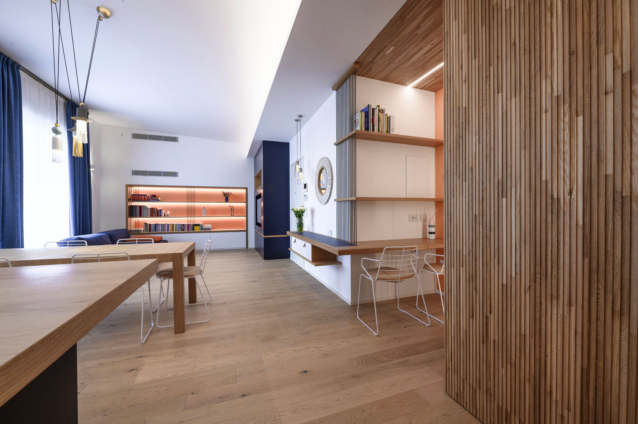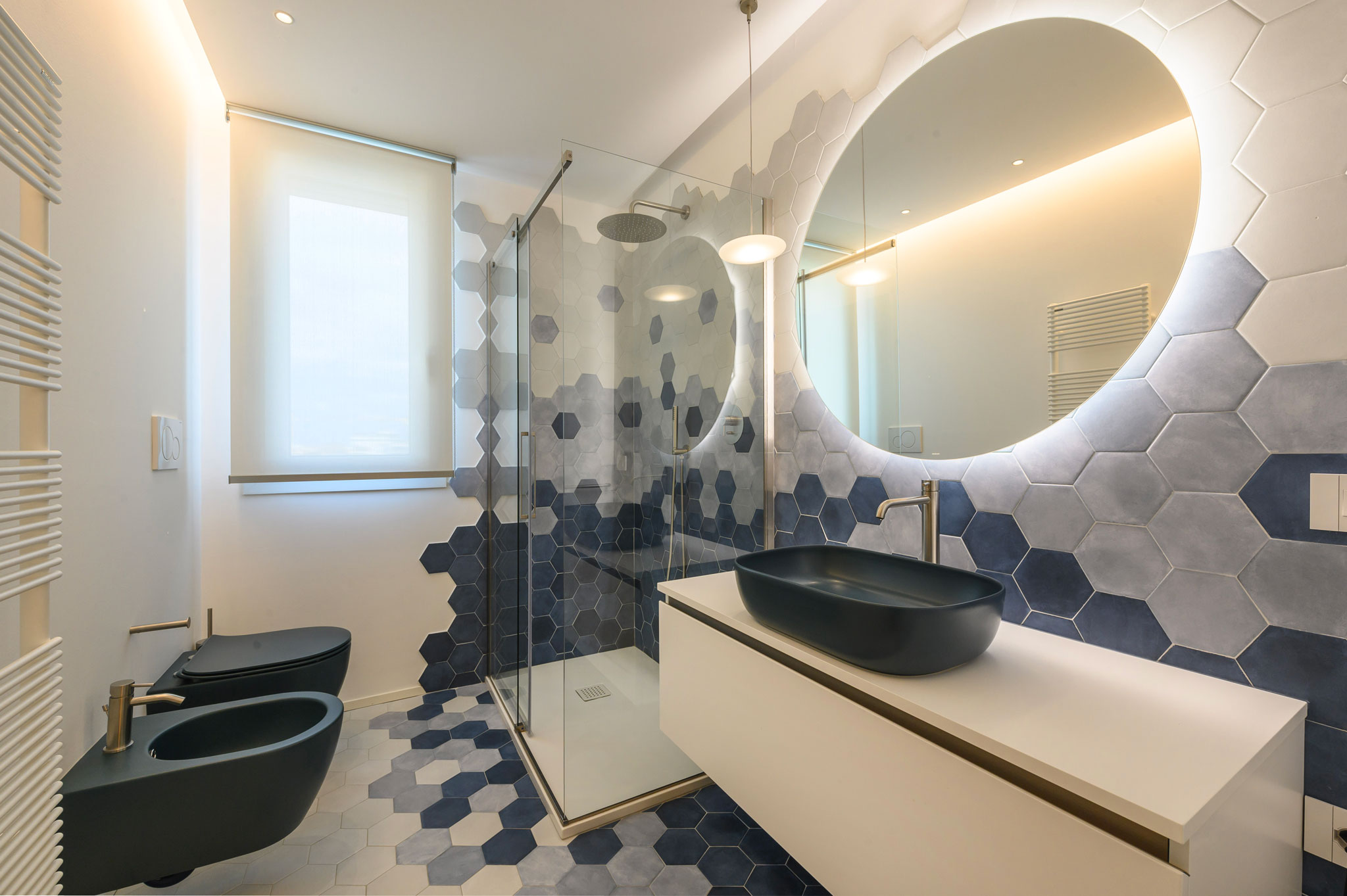 L’intera palette cromatica selezionata per questo progetto prevedeva l’ uso di colori accesi e giocosi e Tonalite ha permesso di scegliere tra una vasta gamma di possibilità, a cominciare dall’ingresso in cui si è stata realizzata una consolle in legno in cui sono state affogate delle piastrelle Nuance blu 7×28, mentre nel bagno la scelta è ricaduta sulla linea Exanuance di Tonalite, nei colori blu, glicine e latte, un mix d’ effetto, dinamico e molto elegante.
