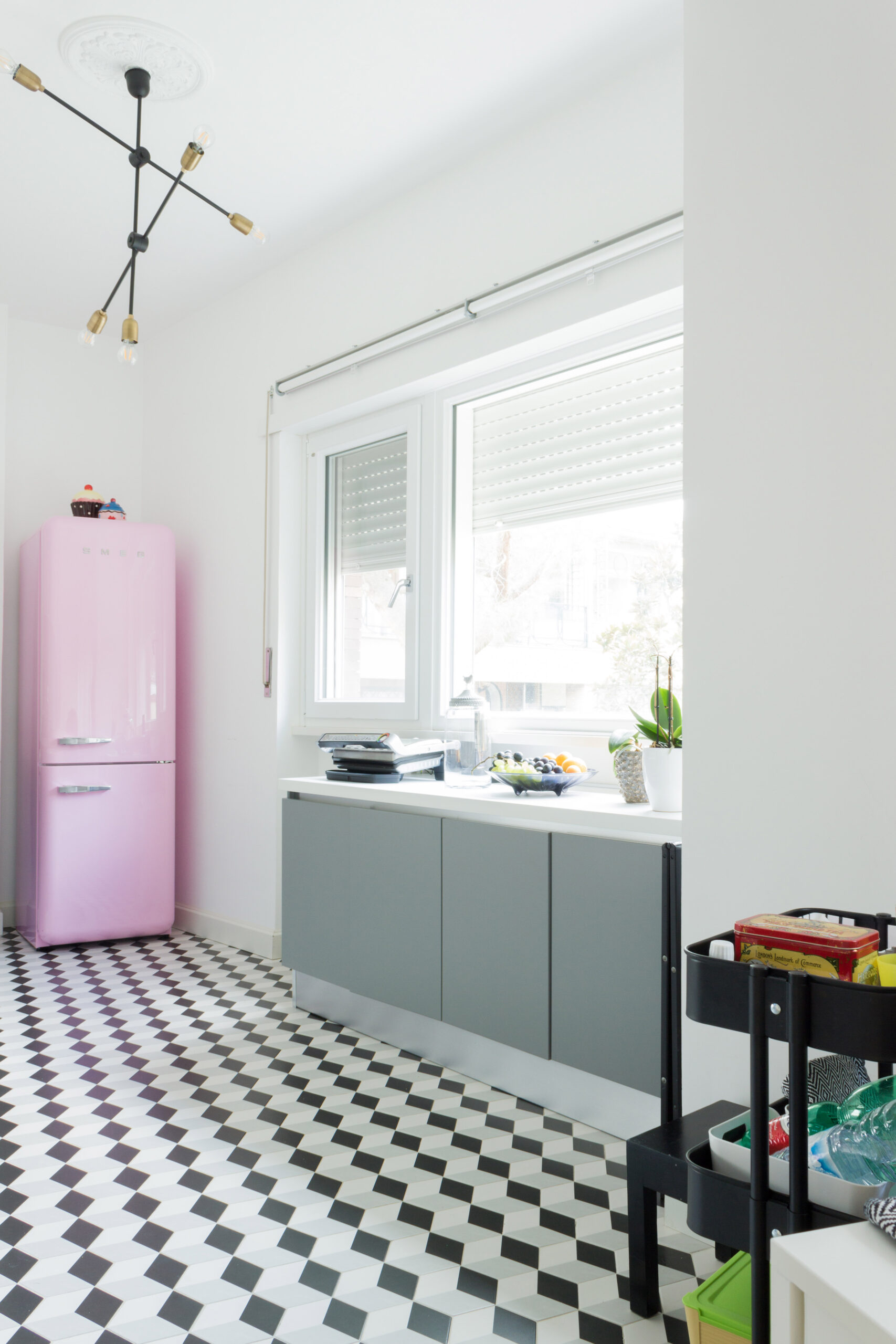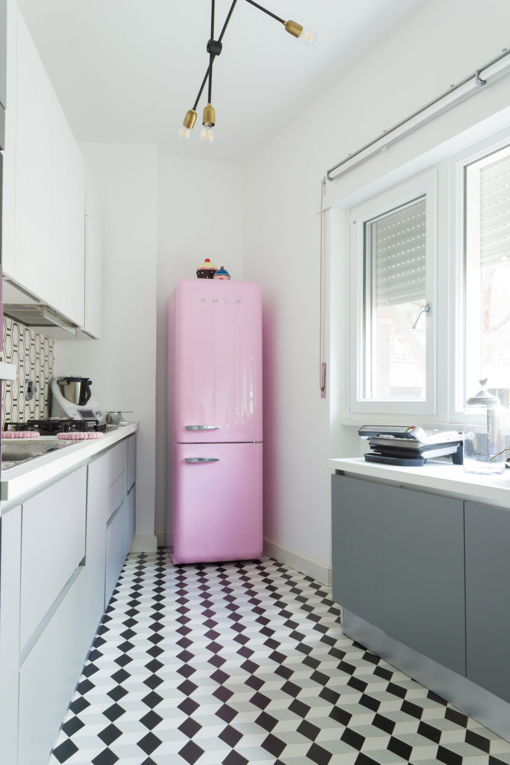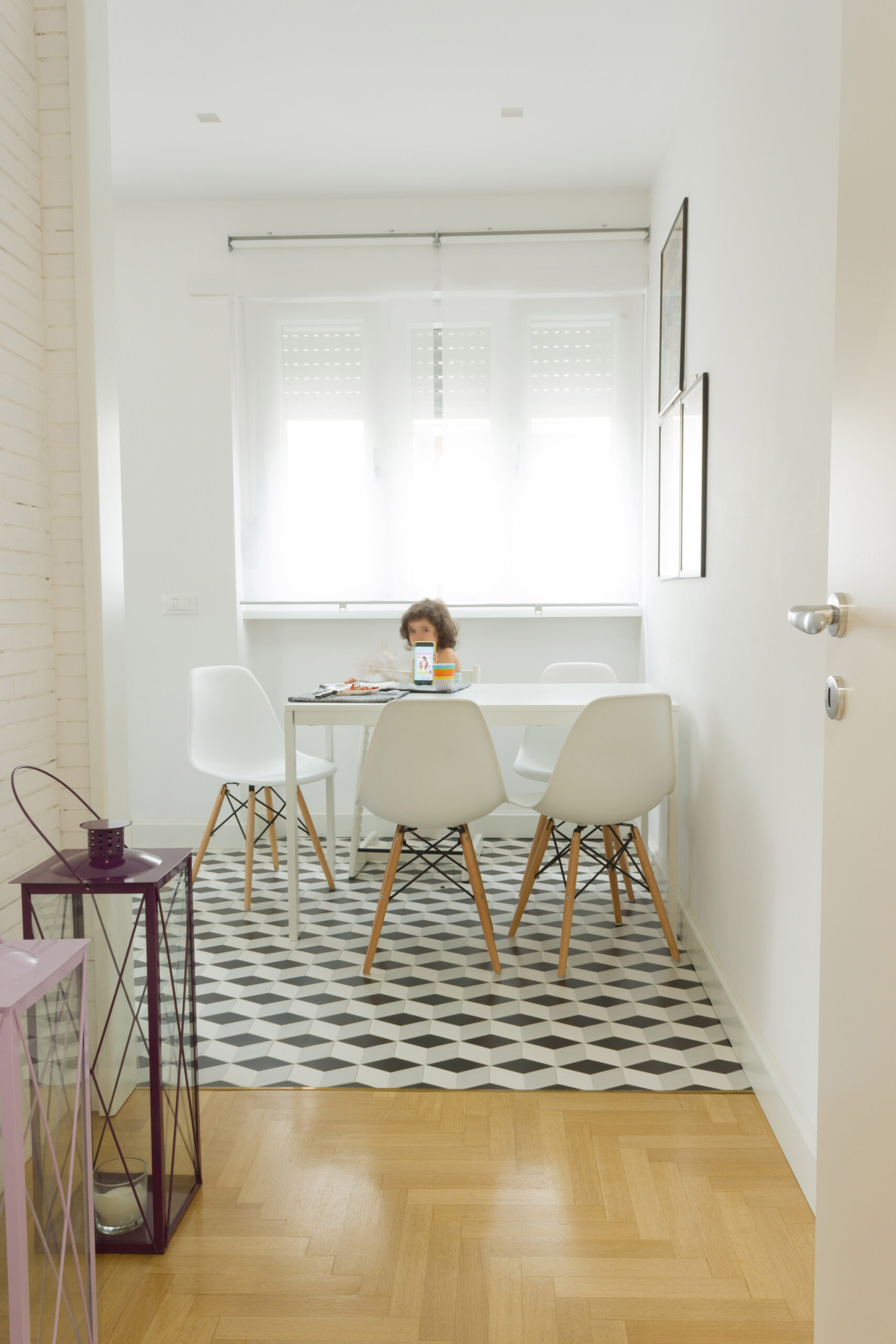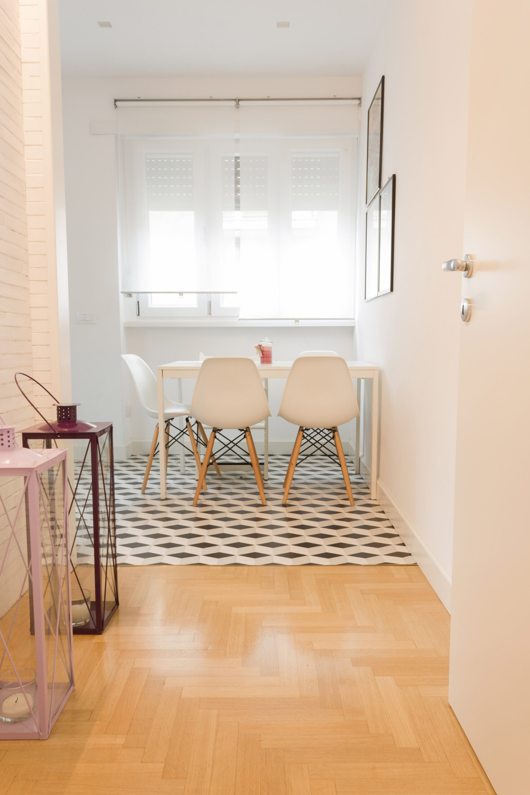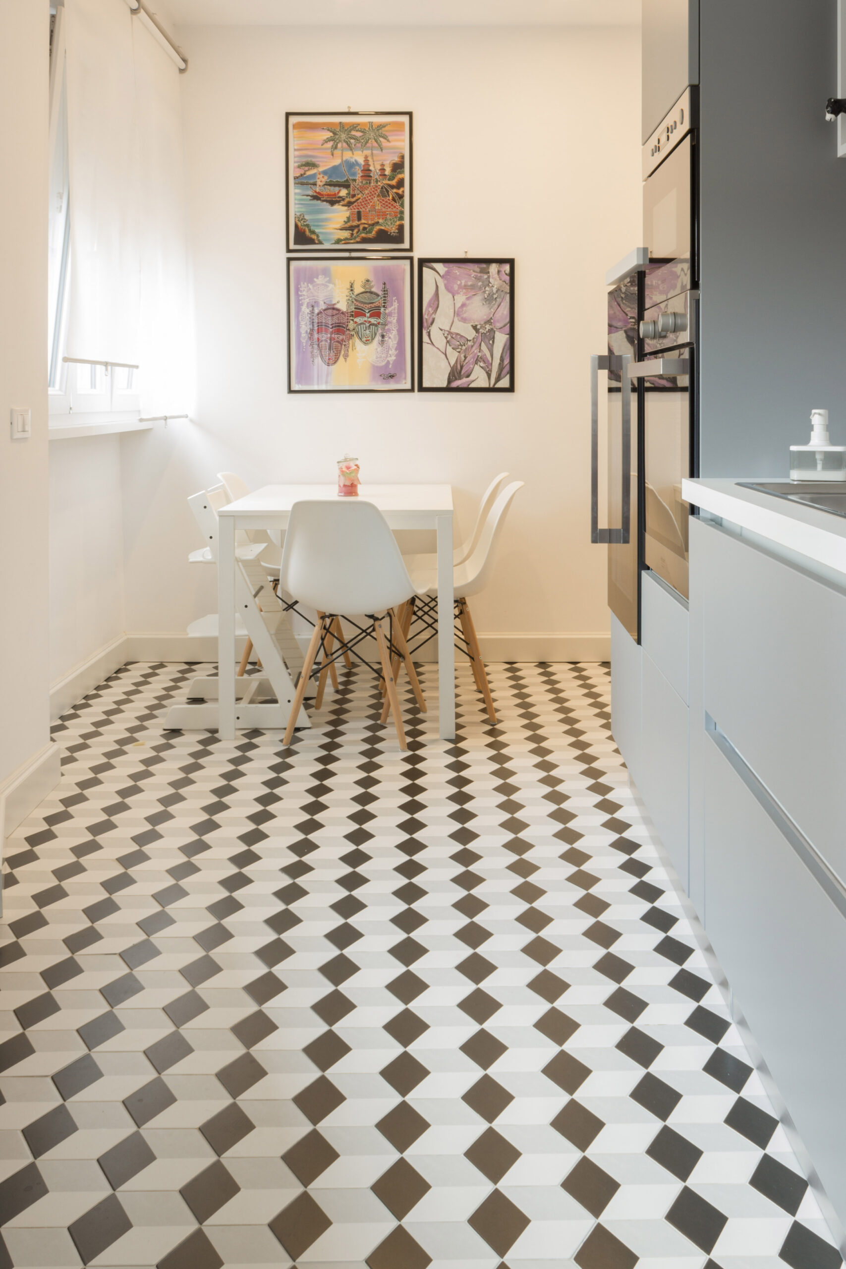 Tutta la progettazione dell’appartamento tiene conto di un delicato equilibrio tra antico e moderno che si è voluto far emergere in ogni stanza. Ambienti di classe caratterizzati dalle presenza di mobili e oggetti importanti di antiquariato e altri famosi pezzi di design contemporaneo convivono a creare spazi eleganti , sobri e dalle linee pulite allo stesso tempo. Così anche in cucina utilizzando la ceramica esagonale abbiamo voluto che accanto al moderno mobilio laccato riecheggiasse un’eco un po’ retrò.