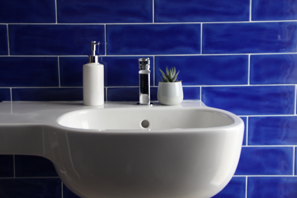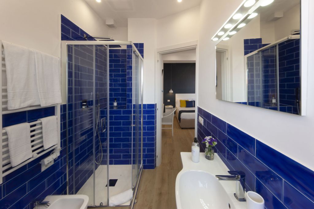 Io, mamma Sofia, ho scelto le piastrelle blu della collezione Kraklé perché mi ricordano il nostro mar Tirreno, intenso e profondo, e l’irregolarità in superficie richiama al tatto il movimento altalenante delle onde. Ho disposto le piastrelle su tutta la superficie del bagno, a tutta altezza nella doccia e a metà altezza per lavabo e sanitari, messa in posa orizzontale e sfalsata. Ho quindi richiamato lo stesso colore sulla parete dietro al letto e nella nicchia dell’appendiabiti in quella che oggi prende il nome di “camera Blu”.