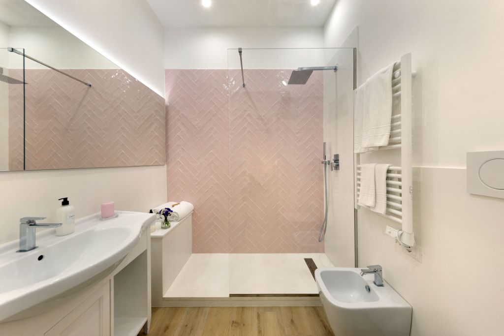 Come un confetto con la sua mandorla, così il bagno rosa con il bianco delle pareti nella camera. Vanno praticamente a nozze!