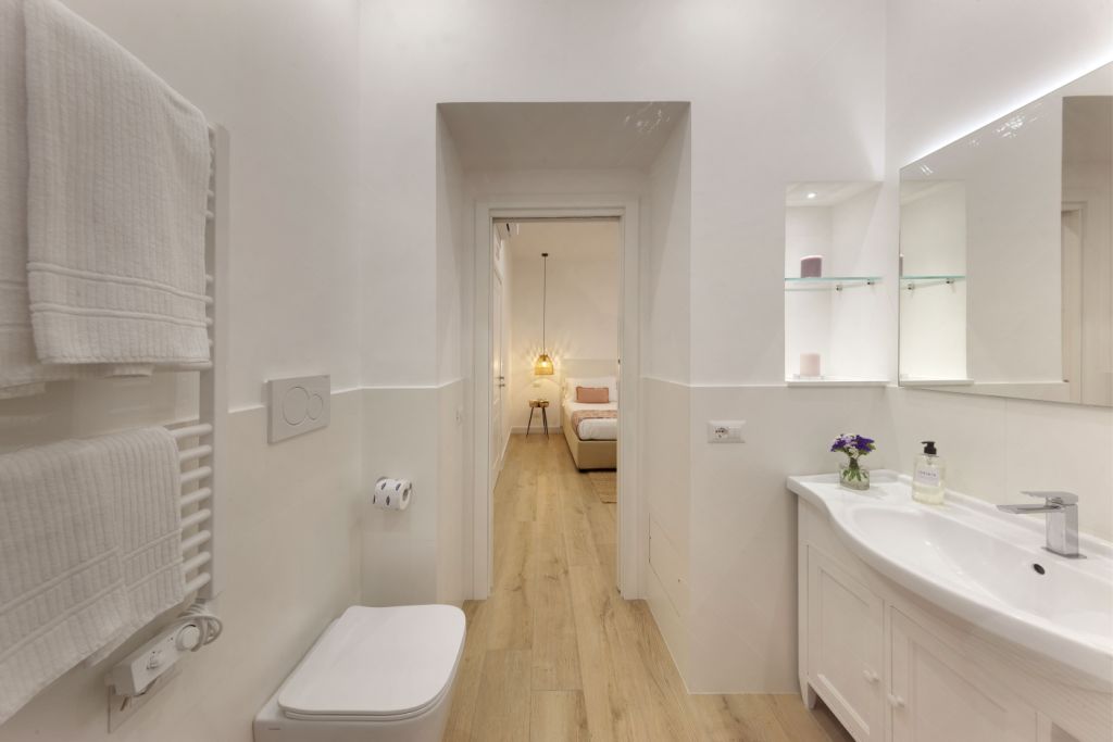 Il lucido della piastrella, disposta soltanto nell’ampia doccia e a lisca di pesce, conferisce un tocco glamour all’intera camera e avvolge morbidamente chi entra come una veste di seta su un corpo sinuoso.