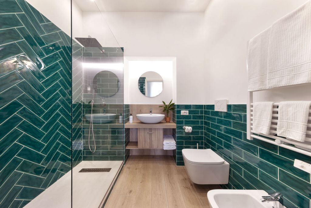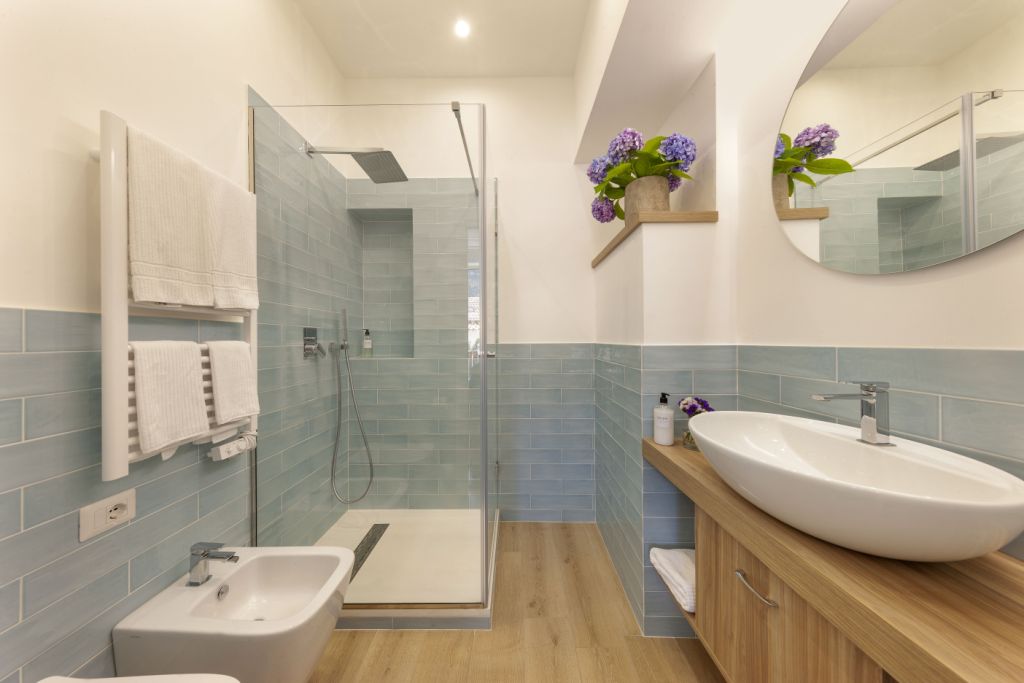 Il lucido della piastrella conferisce luminosità e crea un effetto di stupore a chi entra nell’ambiente. Sono state disposte in orizzontale, a metà altezza e in maniera sfalsata lungo le pareti del bagno, a lisca di pesce e a tutta altezza nella doccia.