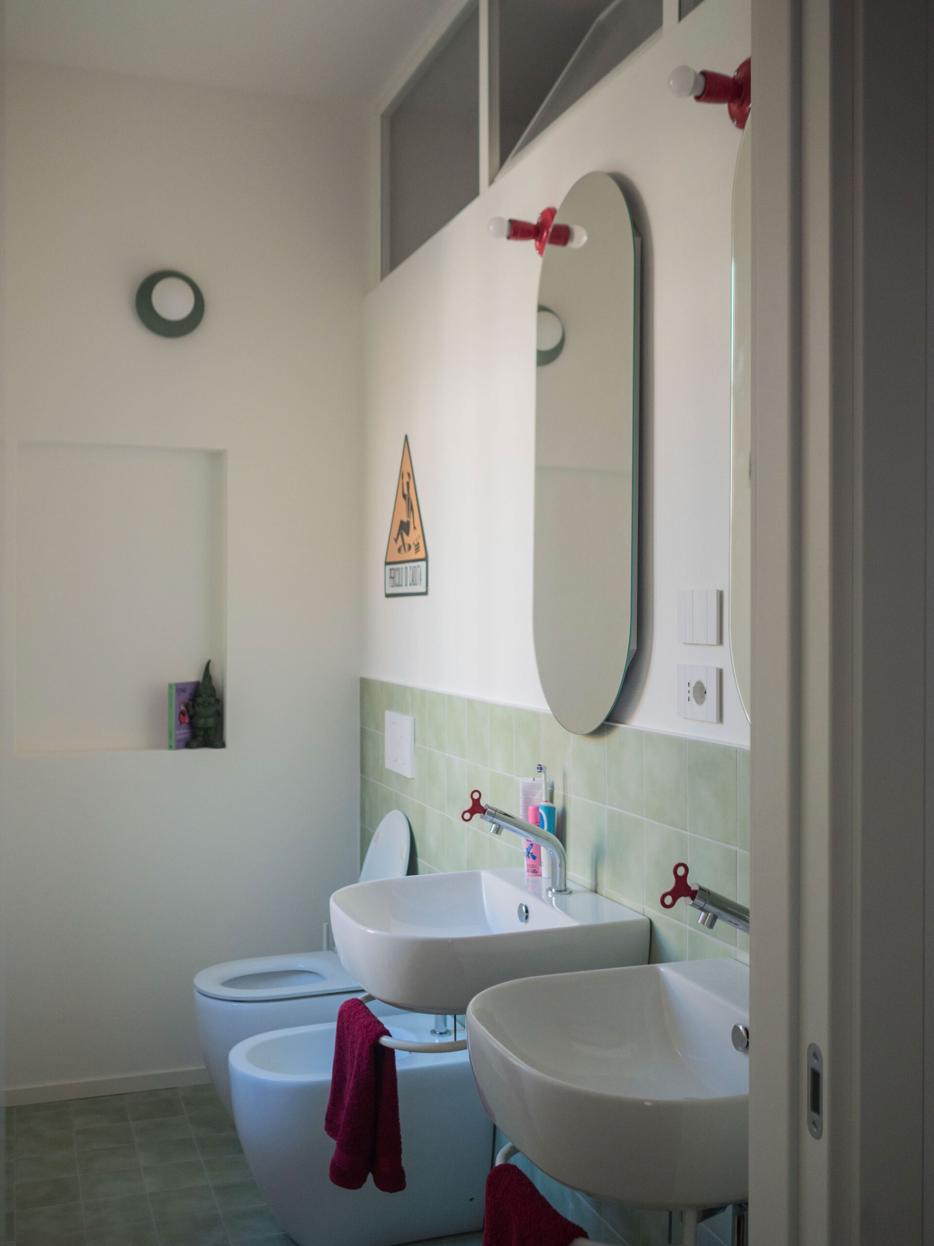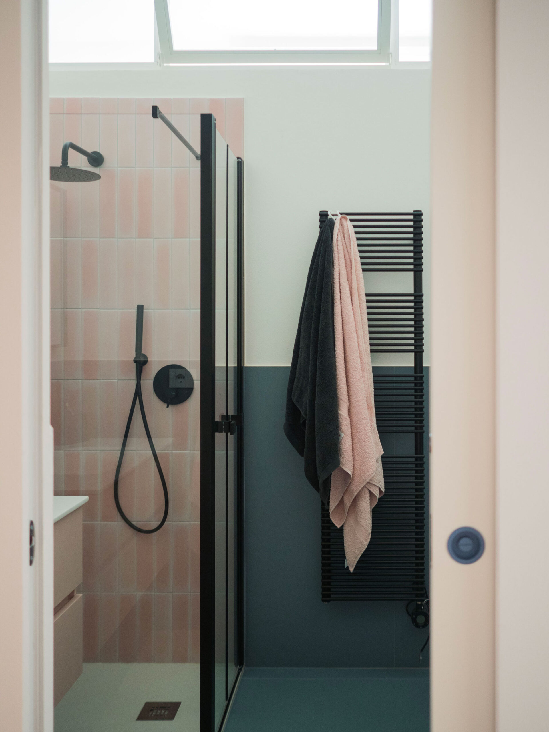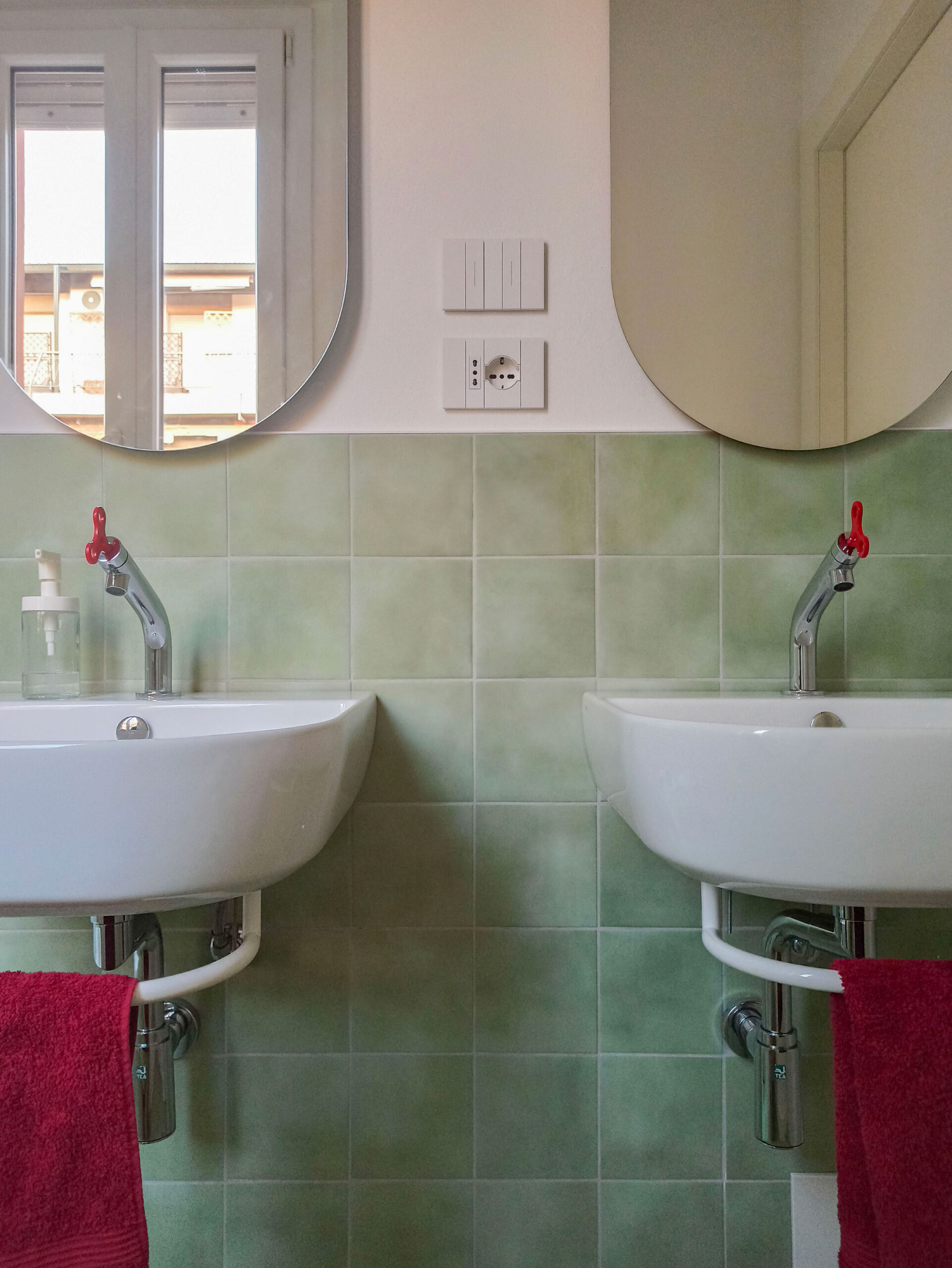 I colori del progetto sono 3: il verde, il rosa e l’avio, che ricorrono in tutti gli ambienti dell’appartamento con combinazioni differenti. Per il bagno più piccolo, quello all’interno della camera matrimoniale, abbiamo scelto di utilizzare un’unica piastrella per pavimento e rivestimento: la piastrella Aquarel, formato 15x15cm, colore verde. In questo caso il verde è il colore dominante dello spazio, alternato al bianco dei sanitari e delle pareti e contrastato con un tocco di rosso presente in piccoli dettagli come i miscelatori, i porta lampada ai lati degli specchi e il radiatore. Per il bagno principale invece abbiamo accostato i colori avio e rosa, utilizzando la piastrella Nuance, formato 7x28cm, posata a correre in verticale per il rivestimento della doccia e accostata a una piastrella grande formato (60×120) colore avio. In questo caso i dettagli come miscelatore, radiatore e portasalviette sono neri e ci piace molto il netto contrasto che crea il colore nero con la piastrella rosa Nuance.