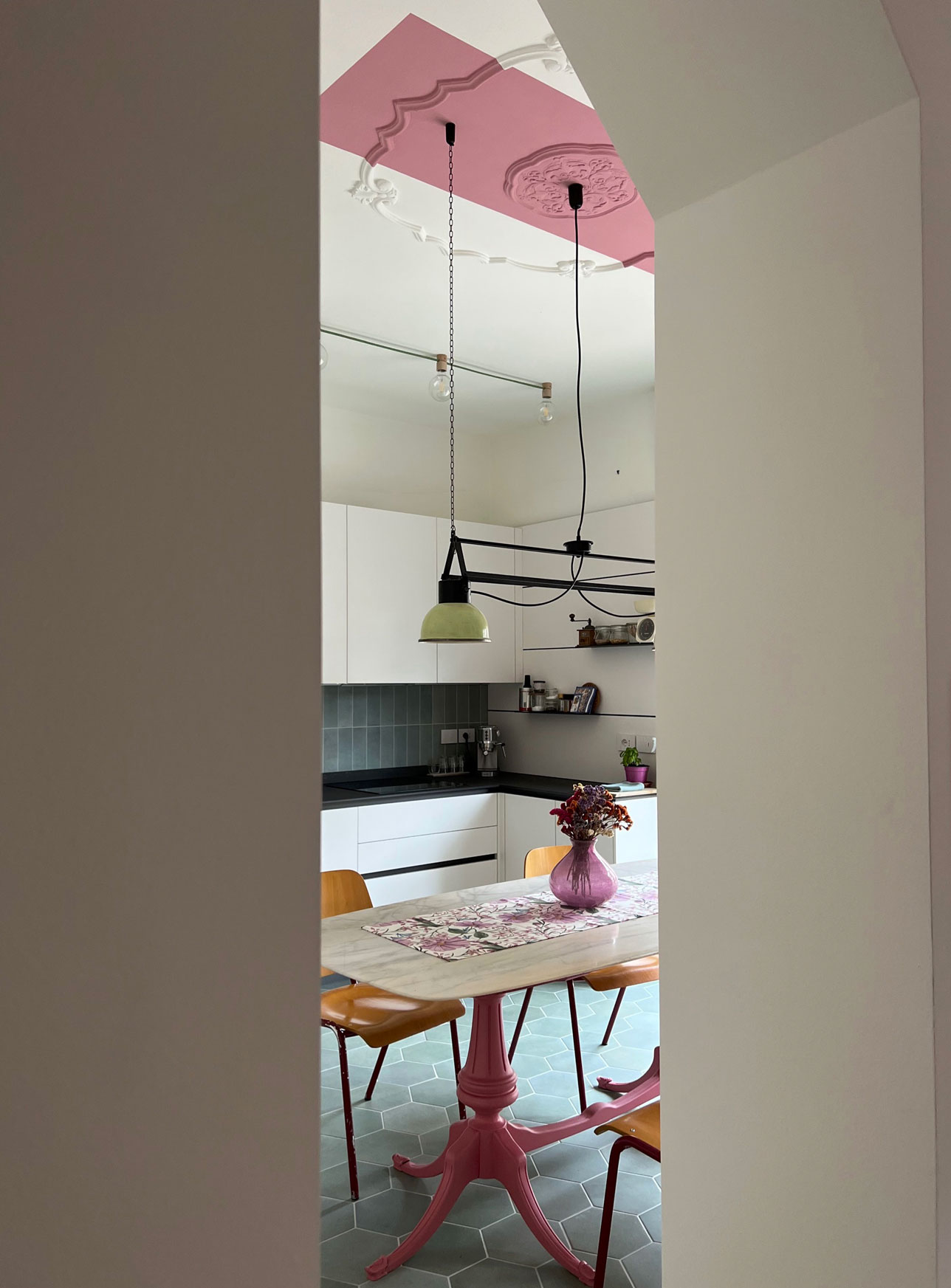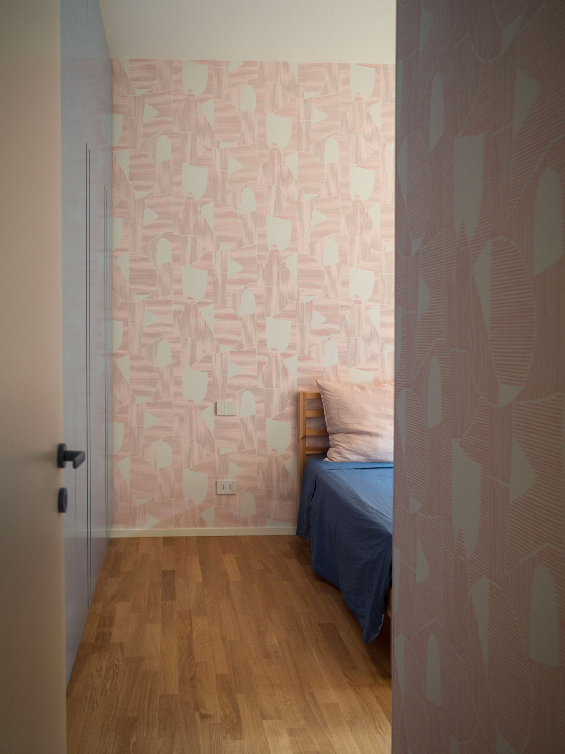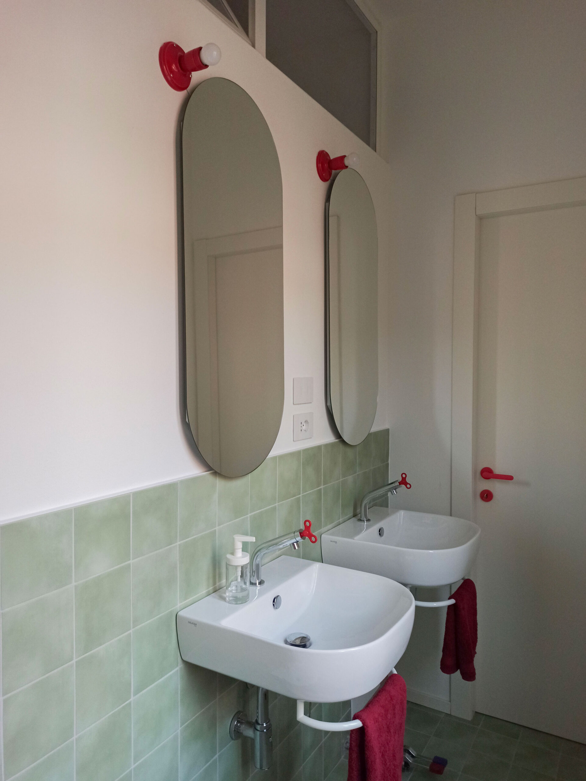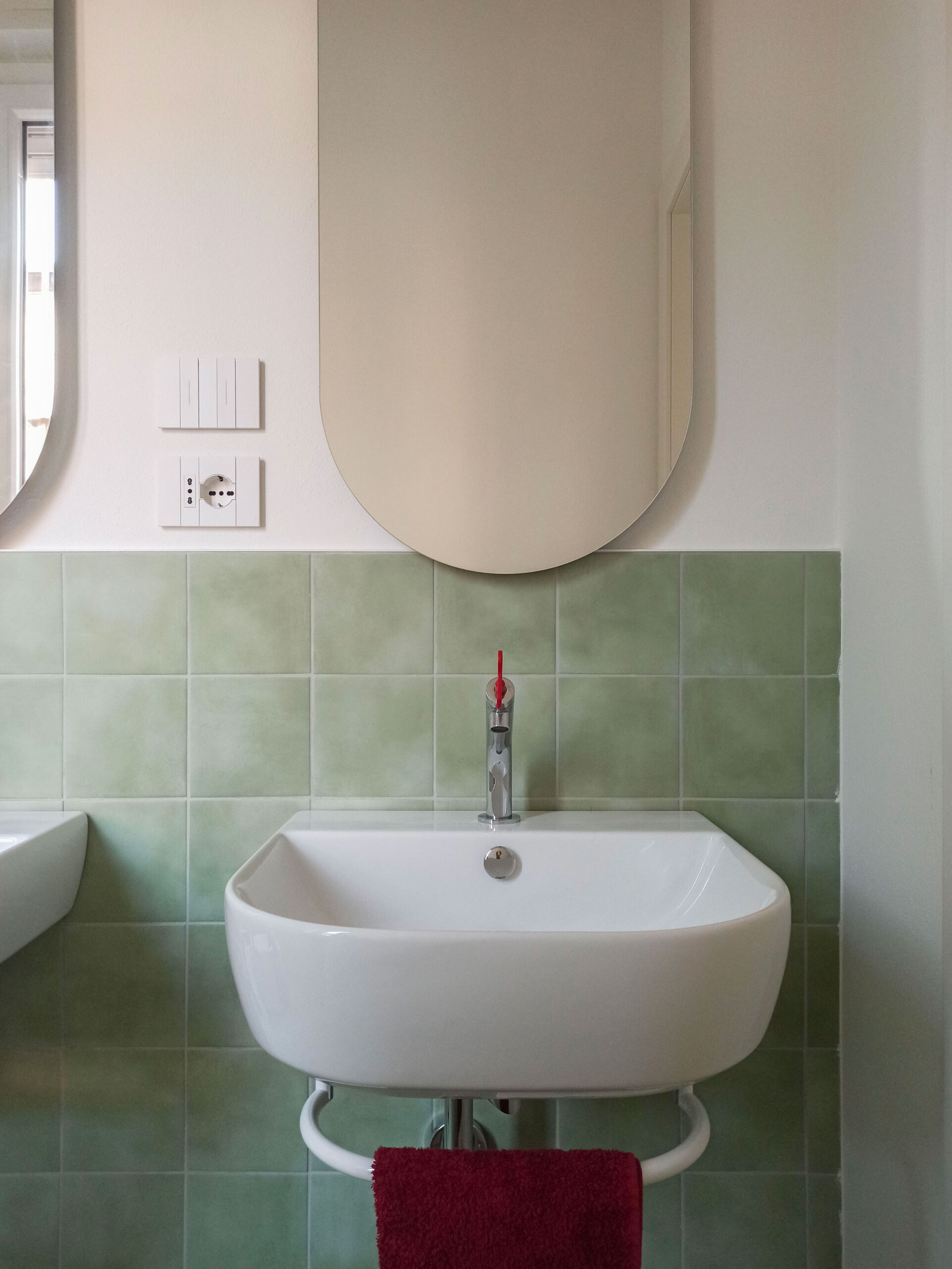 I colori del progetto sono 3: il verde, il rosa e l’avio, che ricorrono in tutti gli ambienti dell’appartamento con combinazioni differenti. Per il bagno più piccolo, quello all’interno della camera matrimoniale, abbiamo scelto di utilizzare un’unica piastrella per pavimento e rivestimento: la piastrella Aquarel, formato 15x15cm, colore verde. In questo caso il verde è il colore dominante dello spazio, alternato al bianco dei sanitari e delle pareti e contrastato con un tocco di rosso presente in piccoli dettagli come i miscelatori, i porta lampada ai lati degli specchi e il radiatore. Per il bagno principale invece abbiamo accostato i colori avio e rosa, utilizzando la piastrella Nuance, formato 7x28cm, posata a correre in verticale per il rivestimento della doccia e accostata a una piastrella grande formato (60×120) colore avio. In questo caso i dettagli come miscelatore, radiatore e portasalviette sono neri e ci piace molto il netto contrasto che crea il colore nero con la piastrella rosa Nuance.