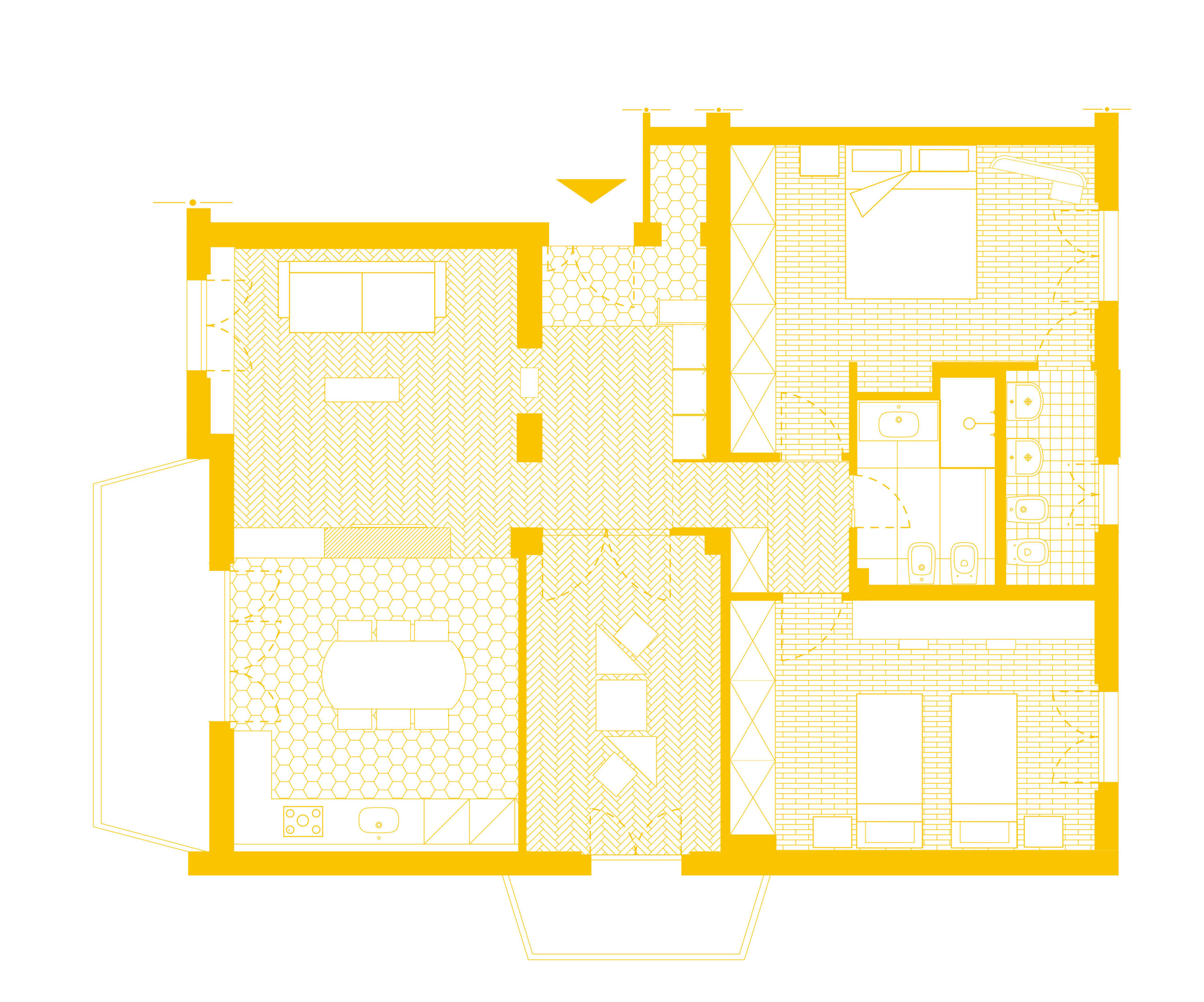 La ristrutturazione dell’appartamento ha previsto la rimodulazione dell’unico bagno presente per crearne un secondo all’interno della camera matrimoniale. Avendo a disposizione metrature non particolarmente generose, la ricerca si è basata su prodotti e formati che potessero caratterizzare l’aspetto dei due ambienti con leggerezza, senza appesantirli, ma con carattere.