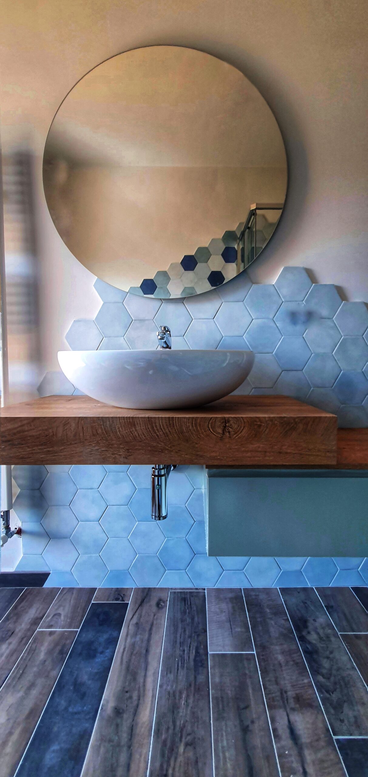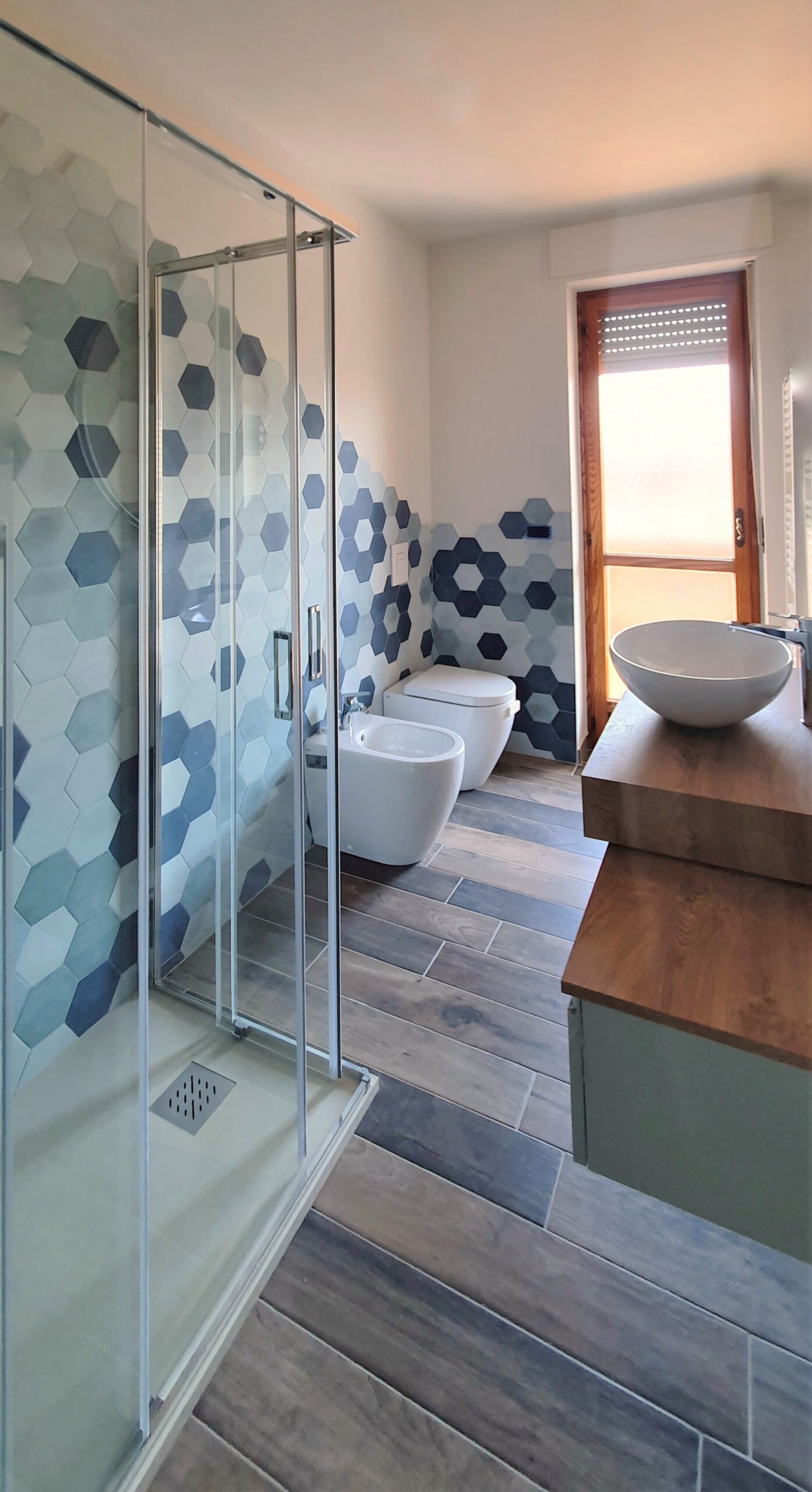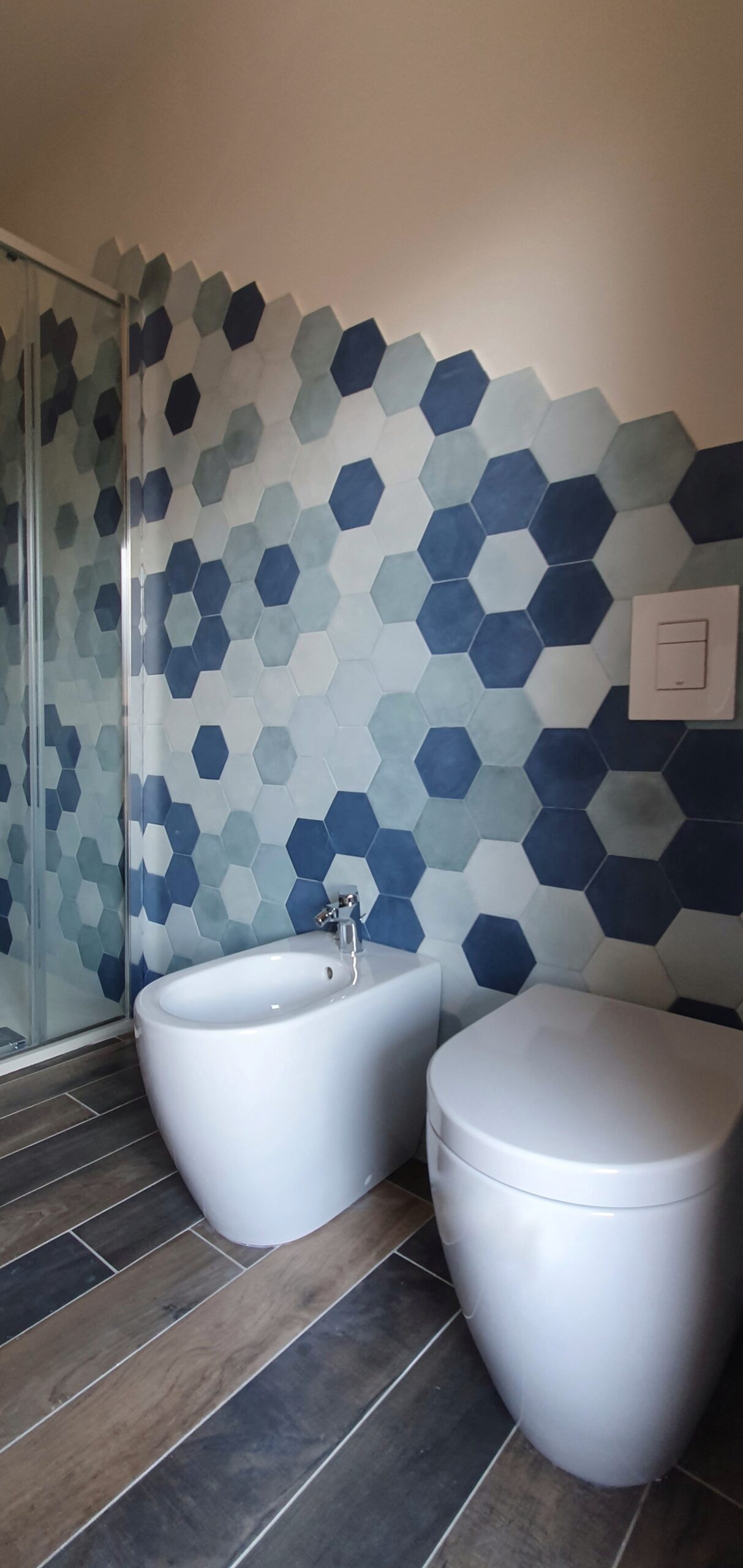 “Quello che permette a questo rivestimento di distinguersi è sicuramente la vibrazione dei colori e la loro disposizione. Si è cercato di creare un gioco di posa diverso dal solito, un gioco con “carattere”. Il primo spunto progettuale lo si deve inizialmente alla possibilità di disposizione dei toni, alla forma esagonale delle piastrelle le quali si prestavano perfettamente ad una composizione originale e successivamente alla ricerca del particolare e anche, se vogliamo, dell’estroso. Uno stile e una tipologia di rivestimento adatto a chi vuole fare del proprio bagno una vera e propria arte. Progettare a misura del cliente, leggere tra le righe e ritrovare la soddisfazione sul suo volto è quello che mi stimola a reinventarmi ogni giorno”. Racconta la progettista.
