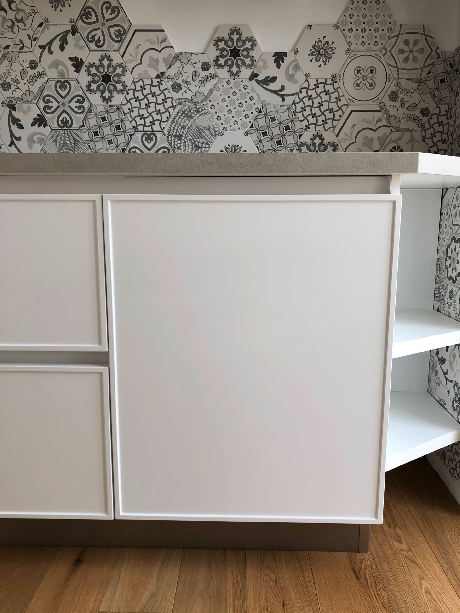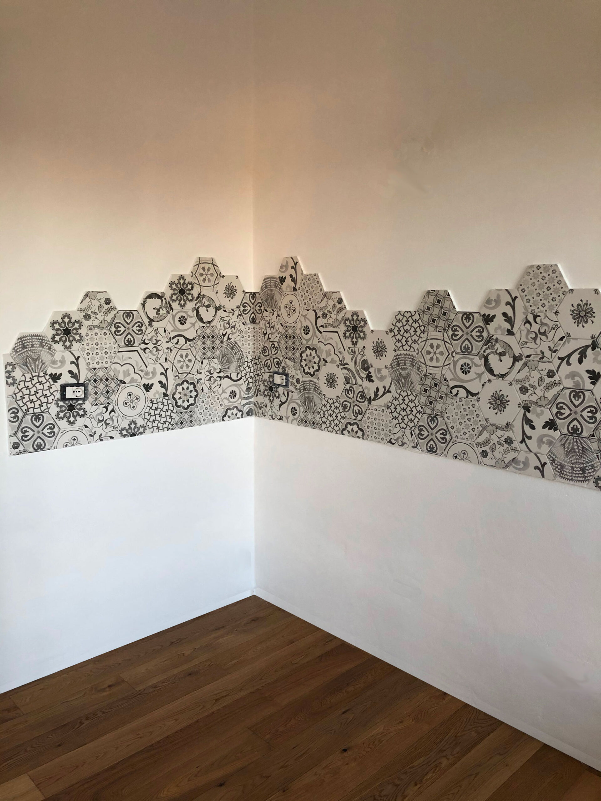 Volevo un materiale ed una forma che riuscissero a dare carattere alla cucina monocolore. La forma esagonale con il mix decoro si integra perfettamente e crea dinamicità nella zona cucina. Ogni forma esagonale ha un decoro diverso da quella a fianco.