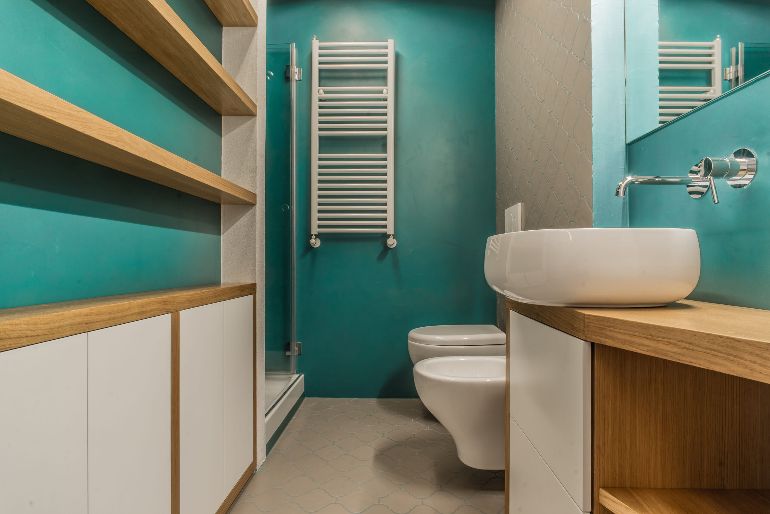 Per quanto riguarda i bagni, l’idea è stata quella di utilizzare un prodotto con un colore neutro con una fuga a contrasto turchese che riprendesse la resina delle pareti.