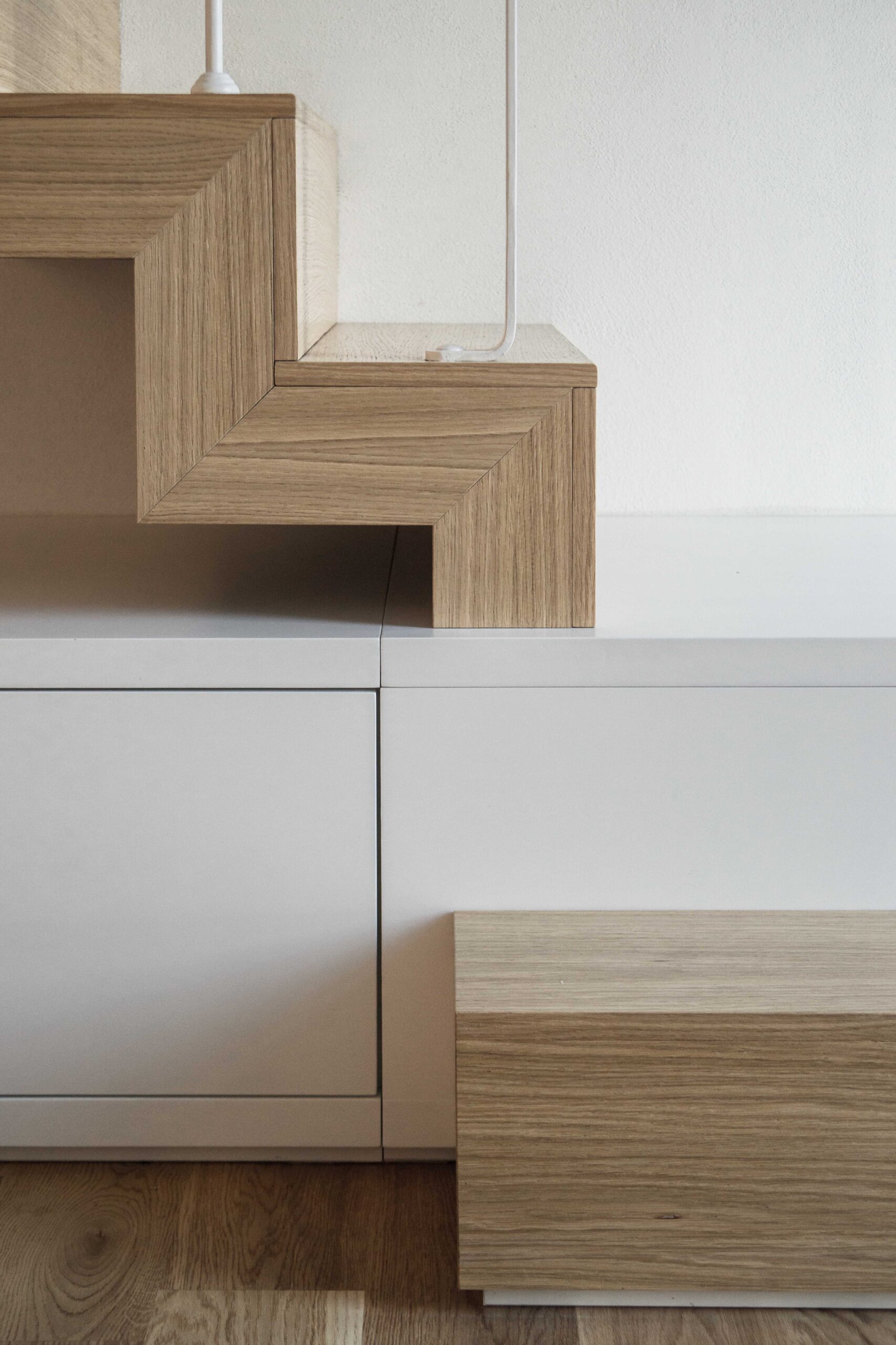 Per quanto riguarda gli abbinamenti cromatici dei bagni, il progetto prevede colori neutri per la collezione Arabesque con un forte contrasto cromatico nella scelta della fuga e della resina delle pareti.Per quanto riguarda il soggiorno i toni di grigio Geomat creano infinite sfumature di grigio in contrasto con il pavimento in parquet del soggiorno.