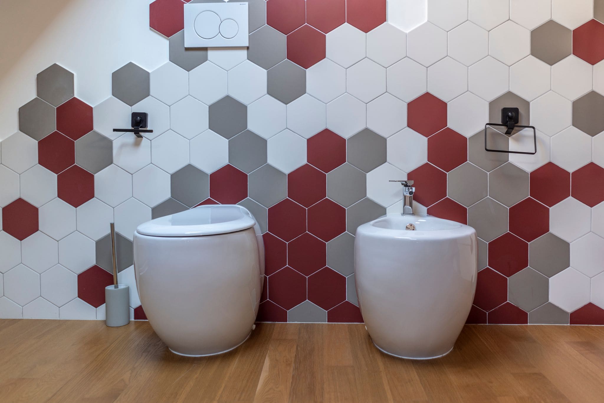 Le esagone bianco e mosto della collezione Examatt sono state accostate ai sanitari bianchi e al pavimento in parquet rovere per completare il bagno.