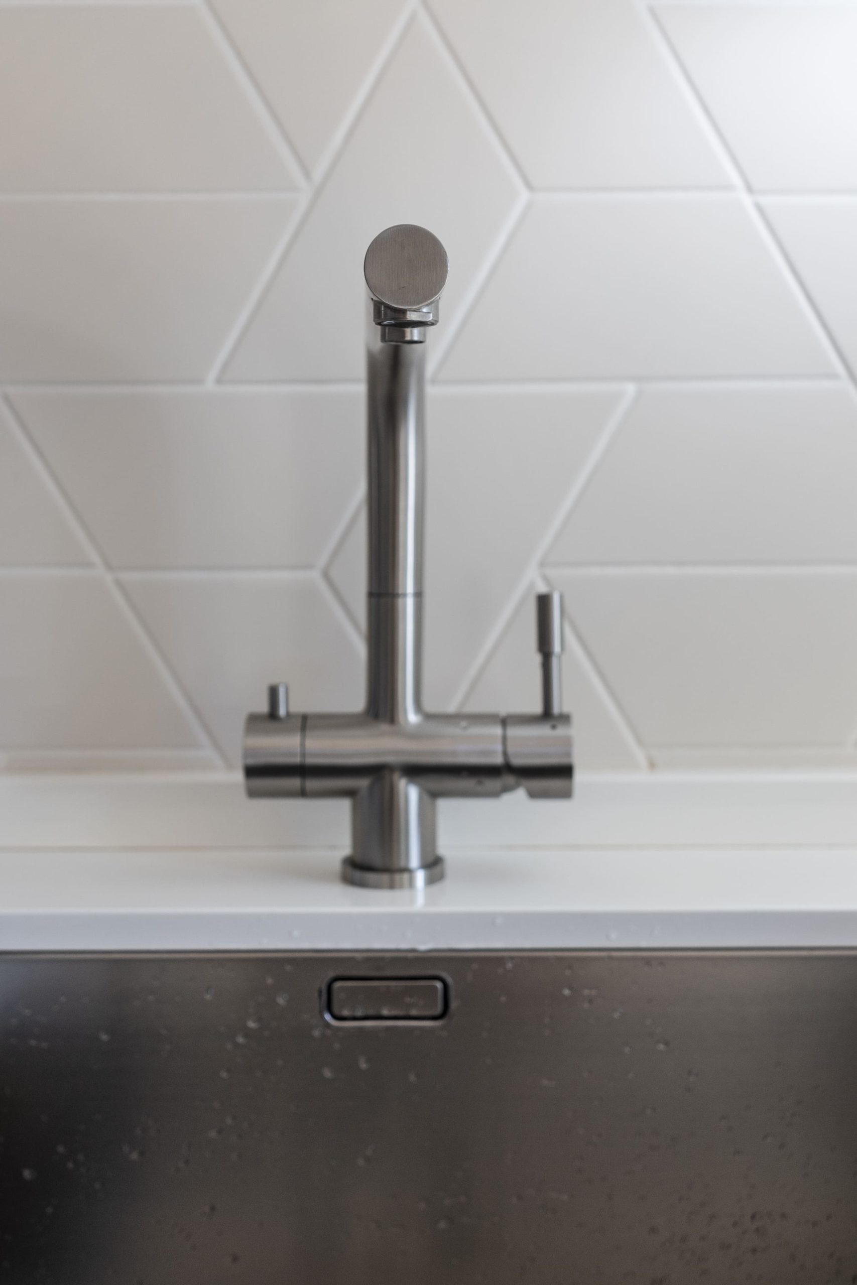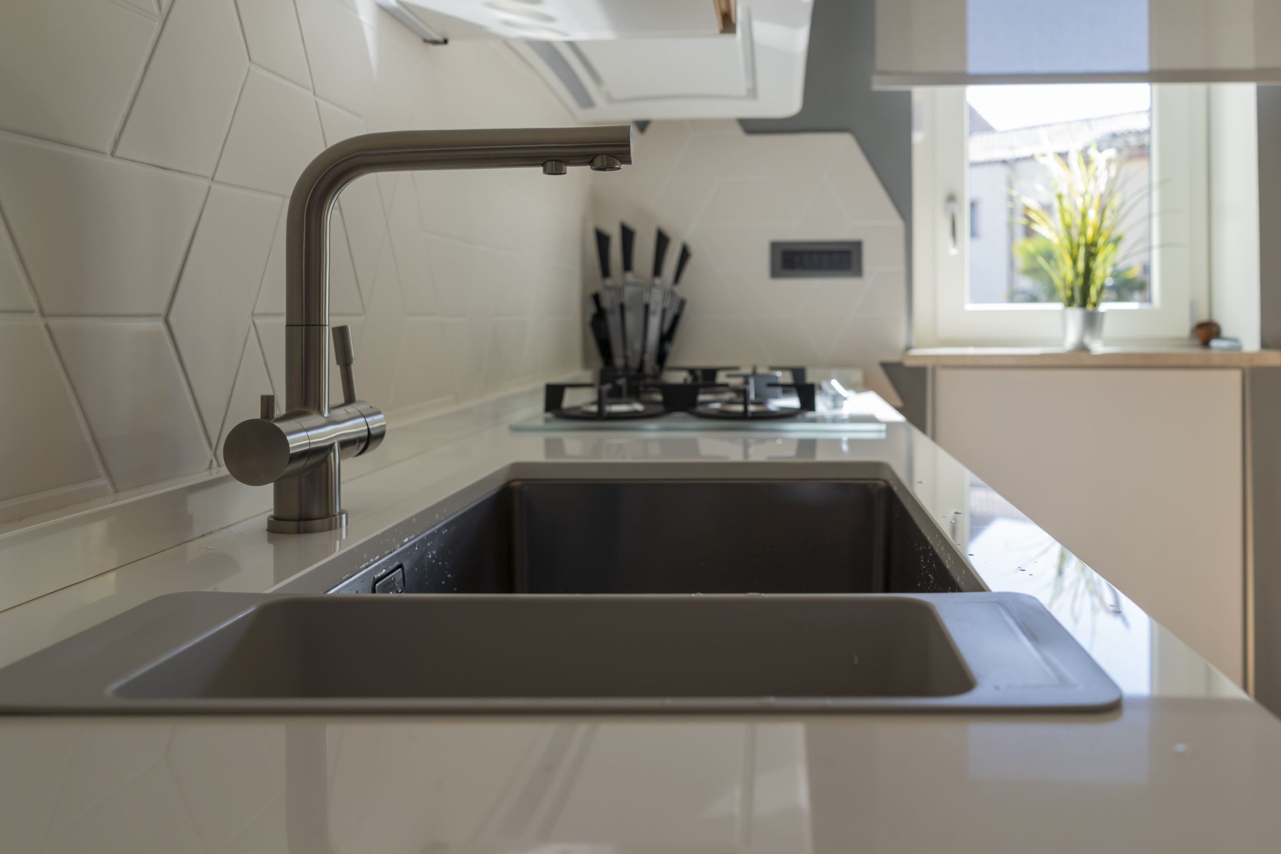 Le piastrelle della collezione Trapez lino sono state inserite come punto di contrasto cromatico e geometrico rispetto ai pensili bianchi con gole in legno.